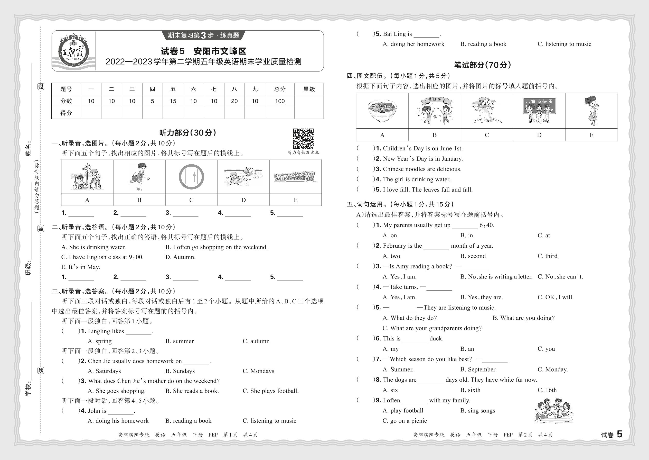 河南省安阳市文峰区2022-2023学年第二学期五年级英语期末学业质量检测(人教PEP版)【5】