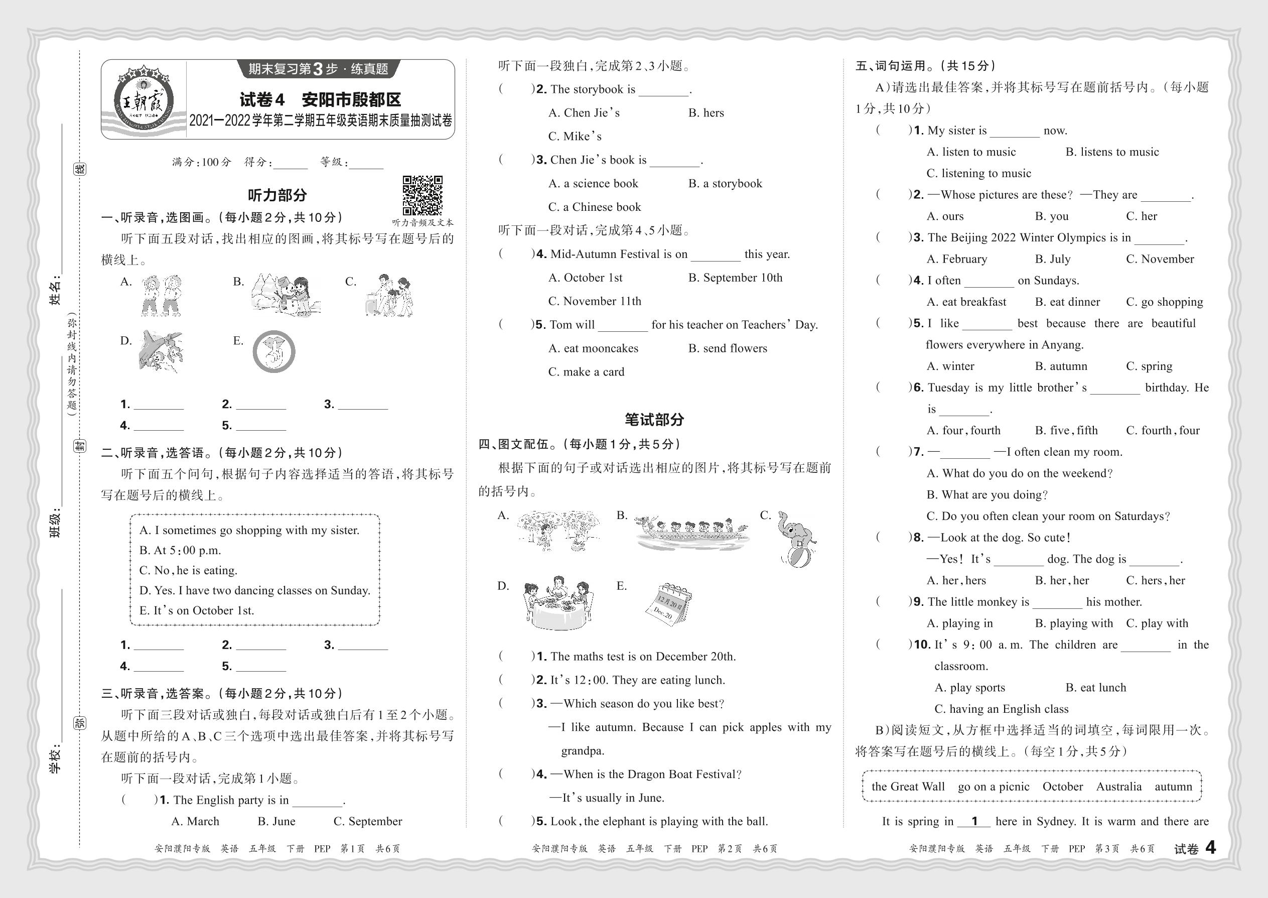 河南省安阳市殷都区2021-2022学年第二学期五年级英语期末质量抽测试卷(人教PEP版)【4】