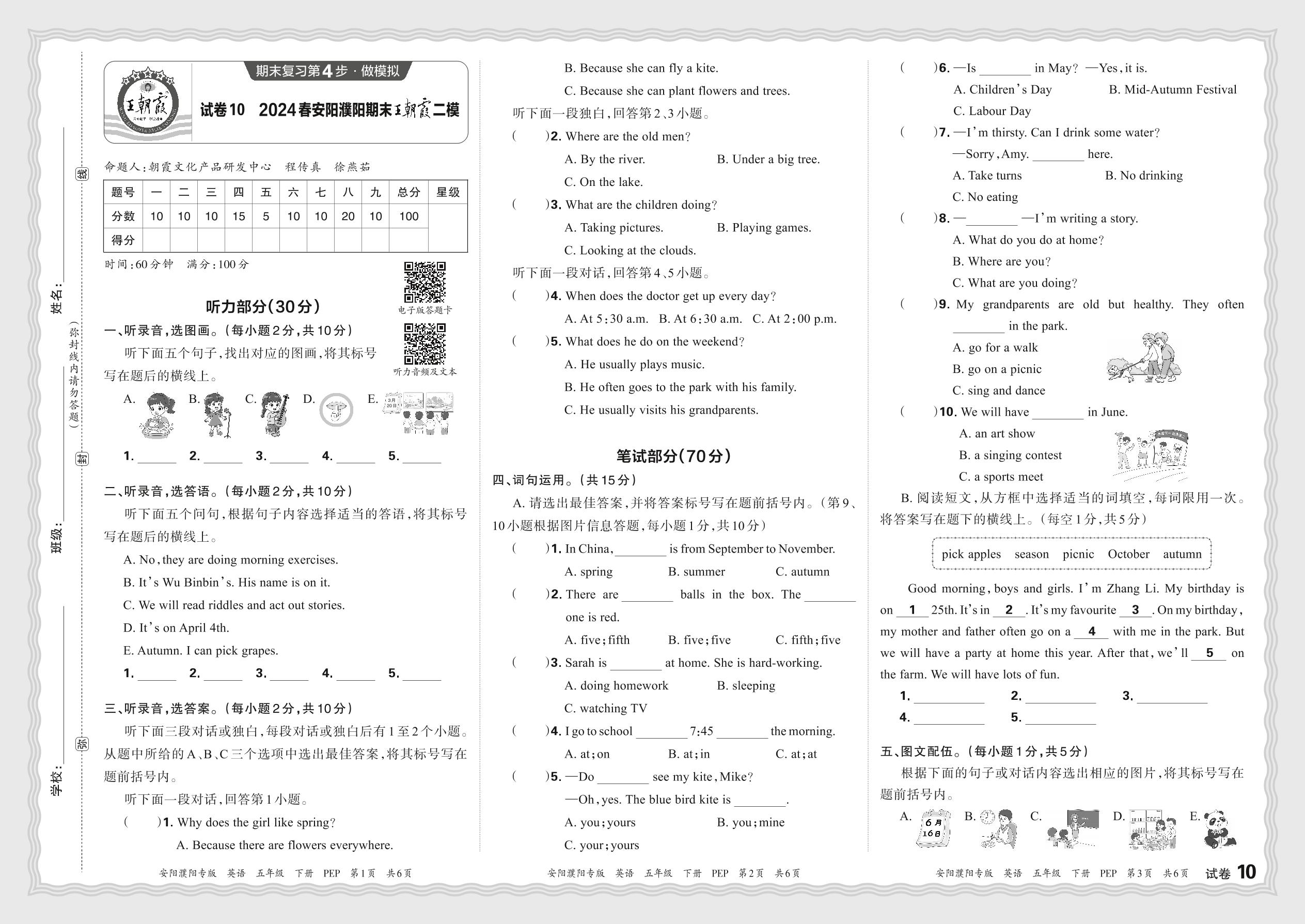 2024春下册五年级英语人教PEP版 河南安阳濮阳期末王朝霞二模【10】
