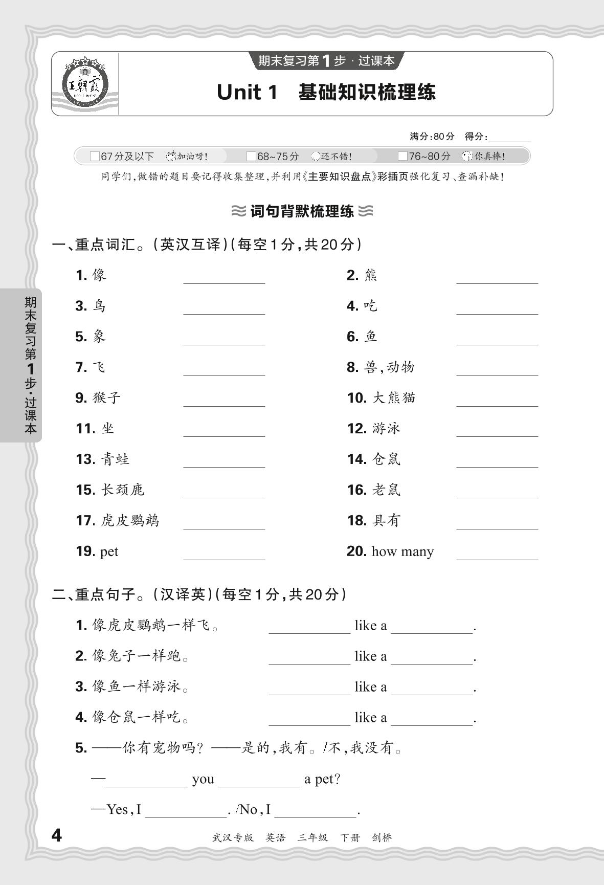 2024春下册三年级英语剑桥版 期末过课本武汉版·Unit 1 基础知识梳理练