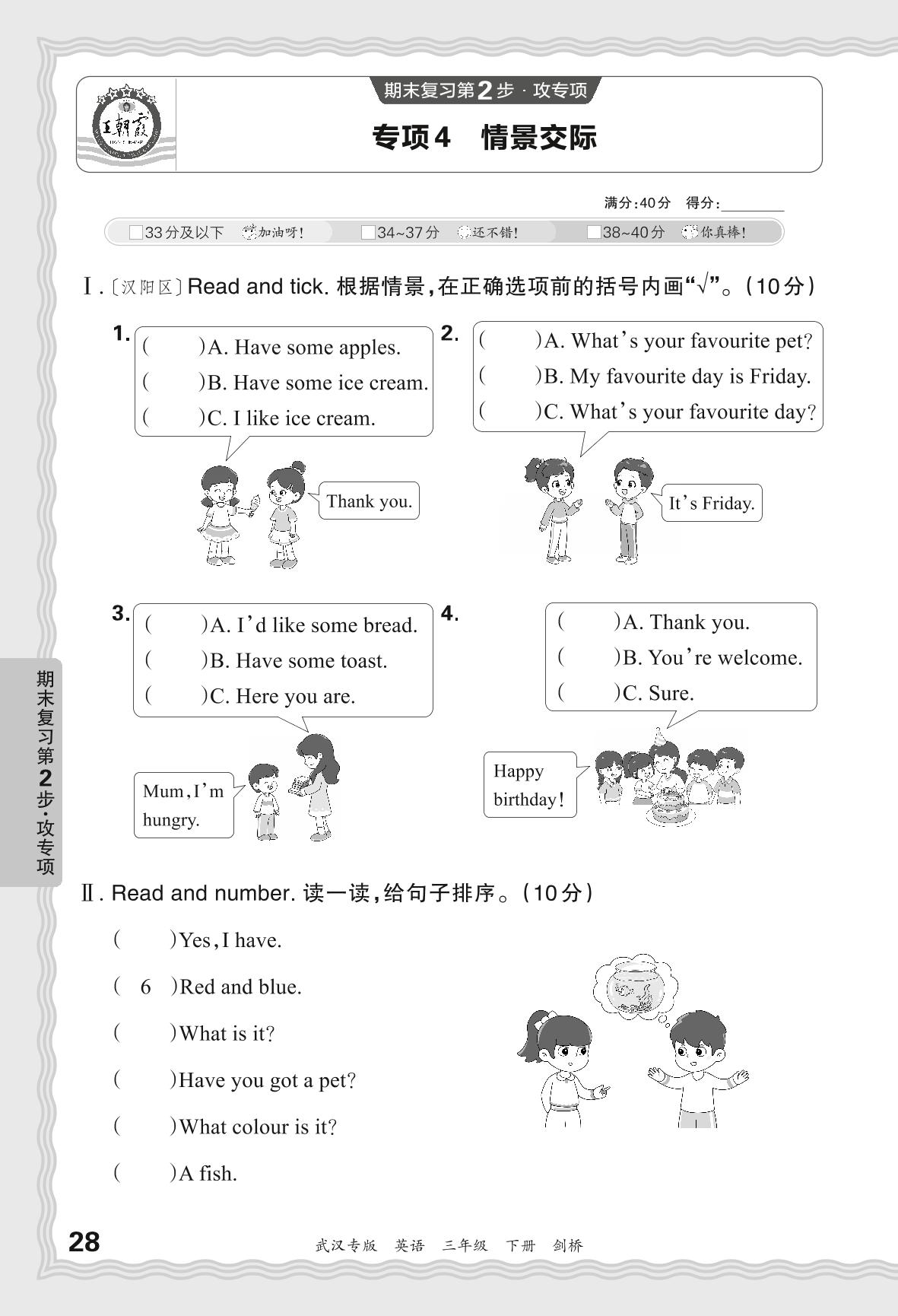 2024春下册三年级英语剑桥版 期末专项卷武汉版·情景交际【4】