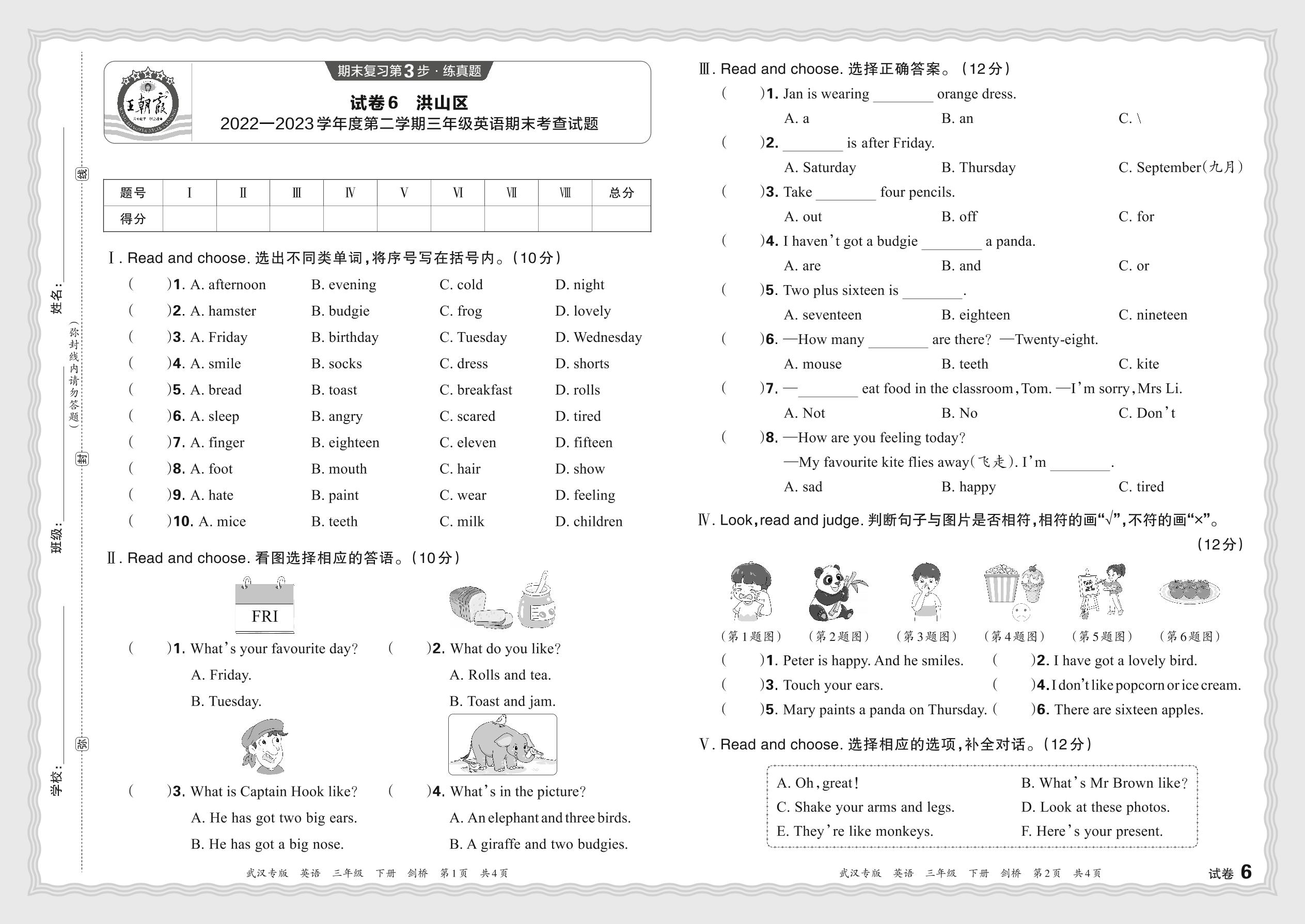 湖北省武汉市洪山区2022—2023学年第二学期三年级英语期末考查试题(剑桥版)【6】