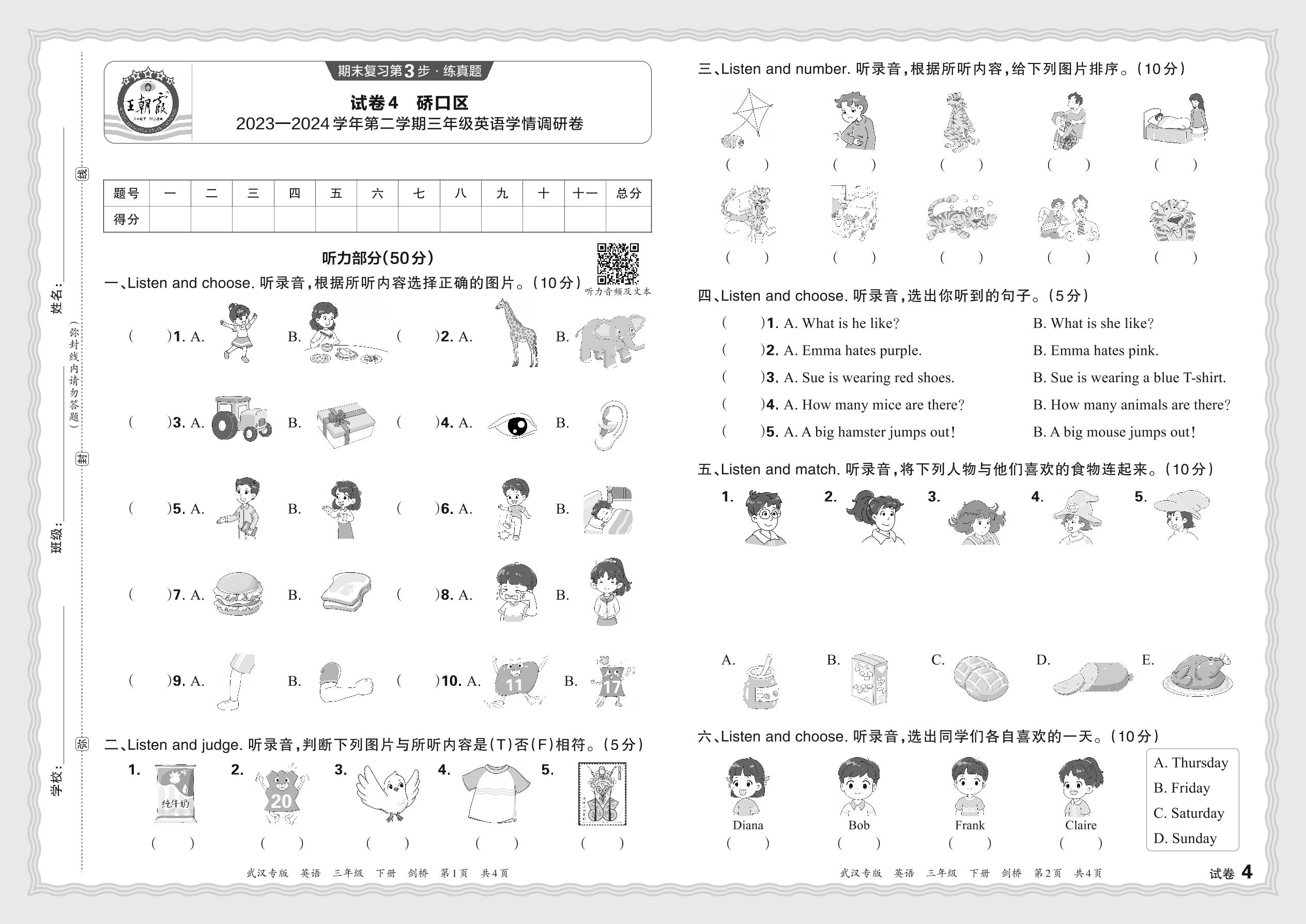 湖北省武汉市硚口区2023—2024学年第二学期三年级英语学情调研卷(剑桥版)【4】