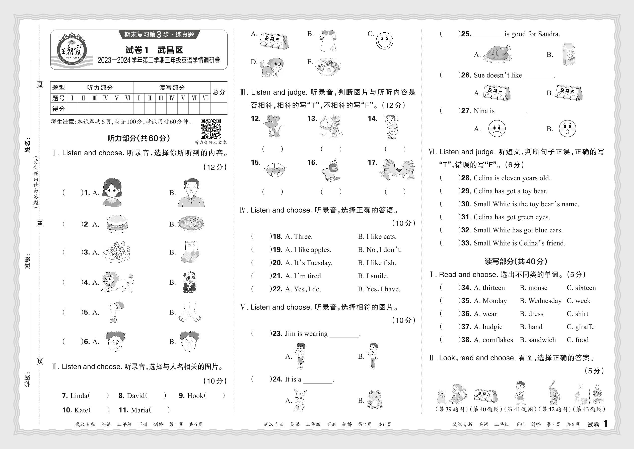 湖北省武汉市武昌区2023—2024学年第二学期三年级英语学情调研卷(剑桥版)【1】