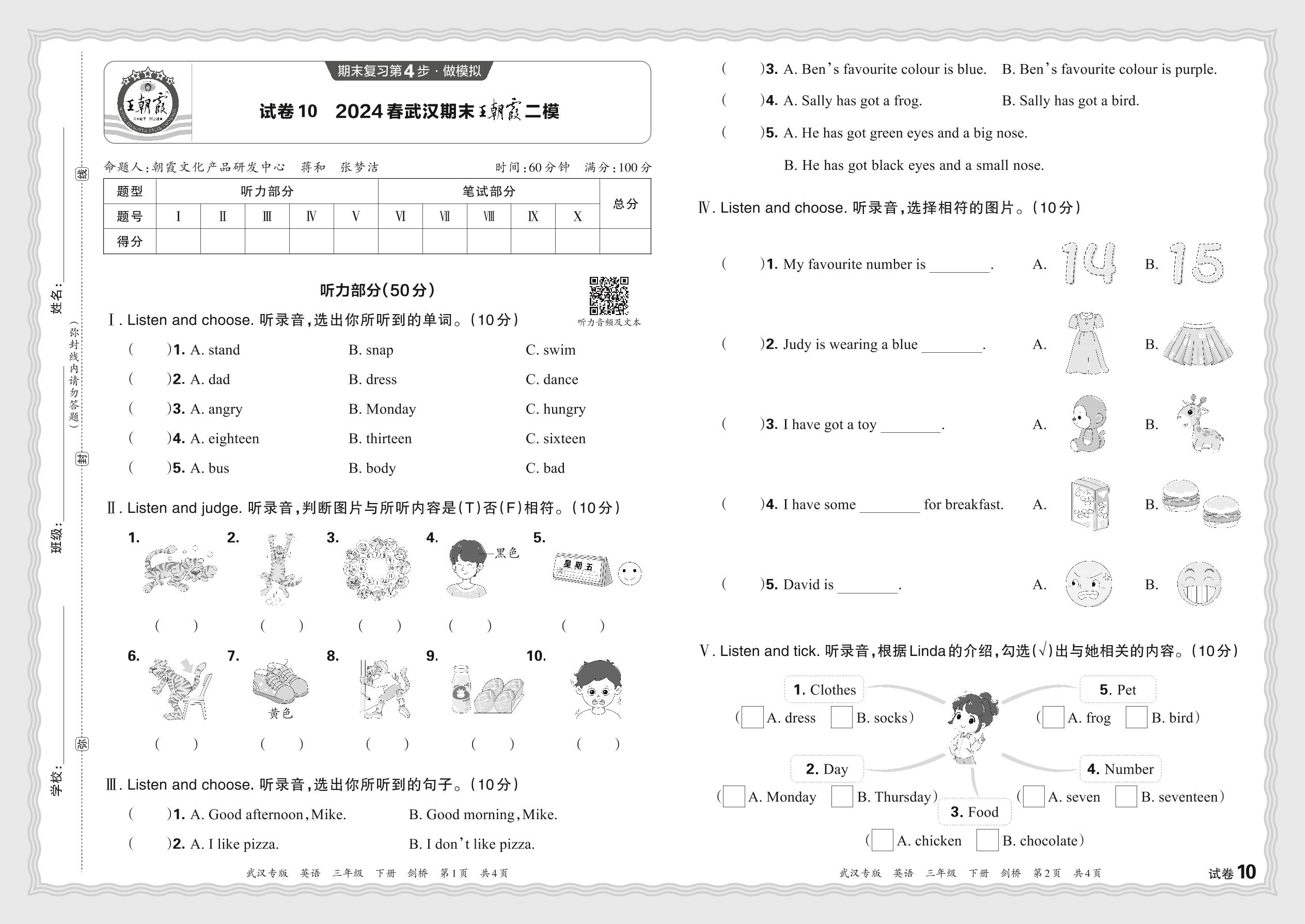 2024春下册三年级英语剑桥版 湖北武汉期末王朝霞二模【10】
