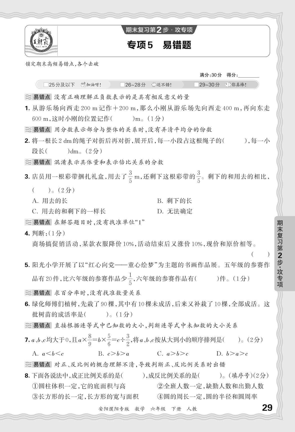 2024春下册六年级数学人教版 期末专项卷安阳濮阳版·易错题【5】