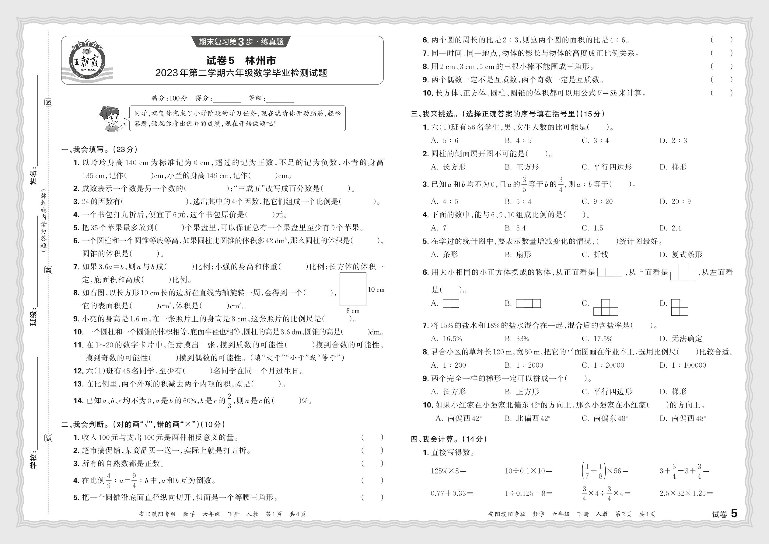 河南省安阳市林州市2023年第二学期六年级数学毕业检测试题(人教版)【5】
