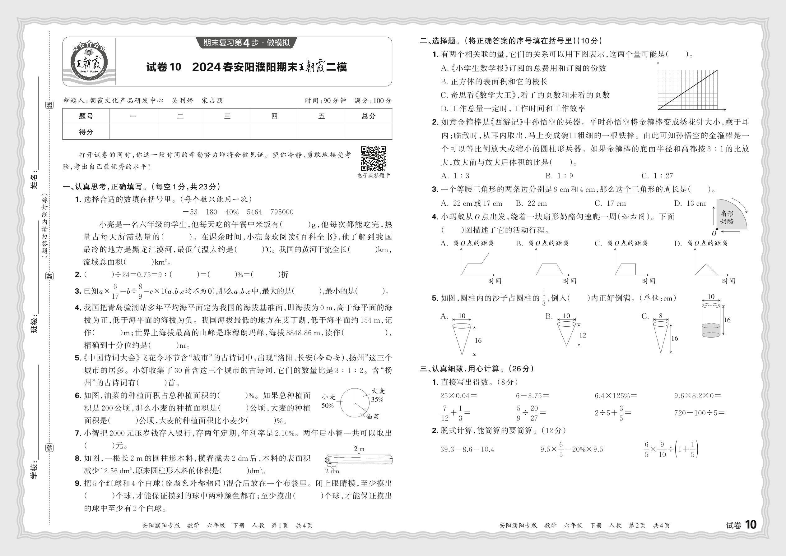 2024春下册六年级数学人教版 河南安阳濮阳期末王朝霞二模【10】