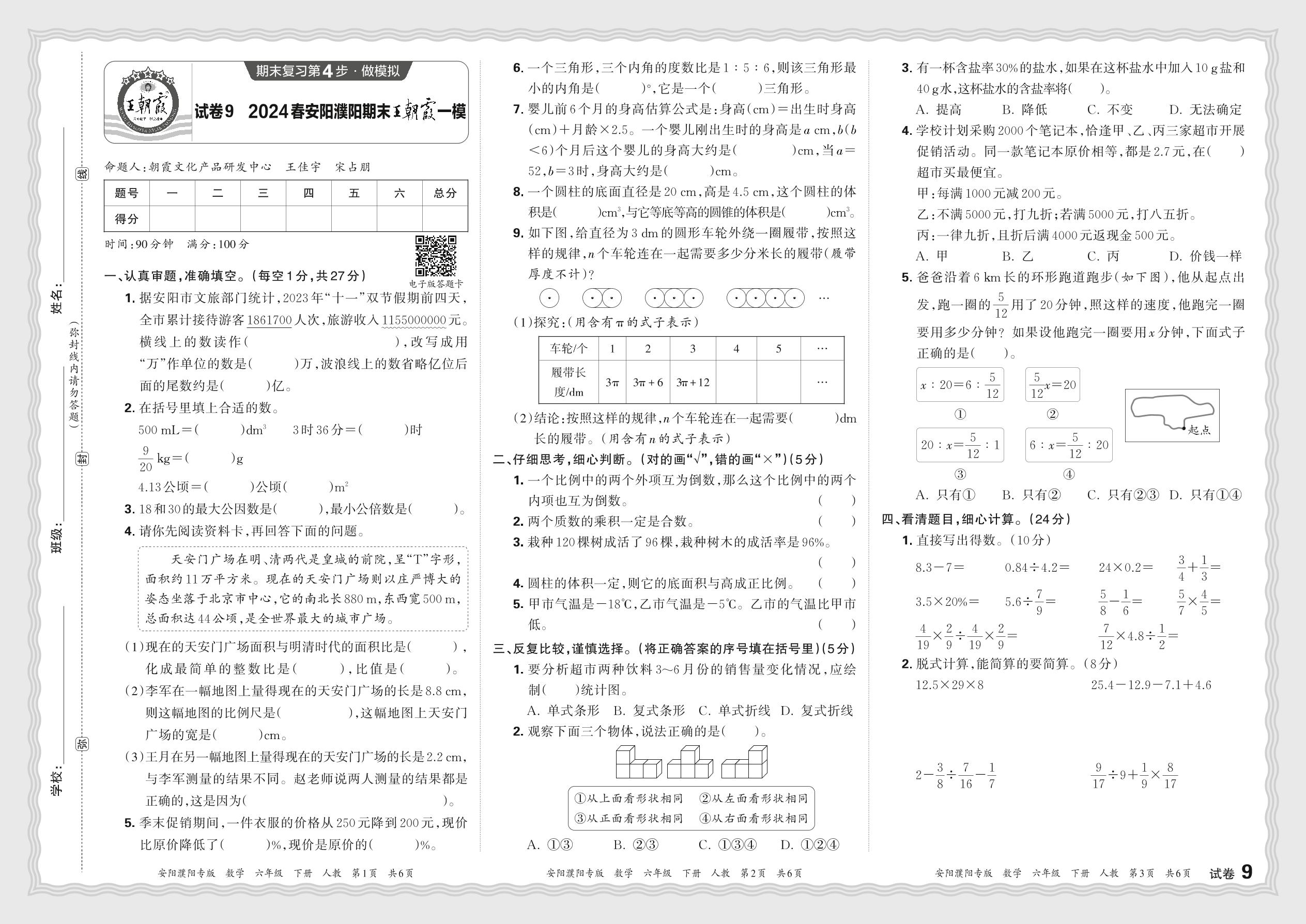 2024春下册六年级数学人教版 河南安阳濮阳期末王朝霞一模【9】