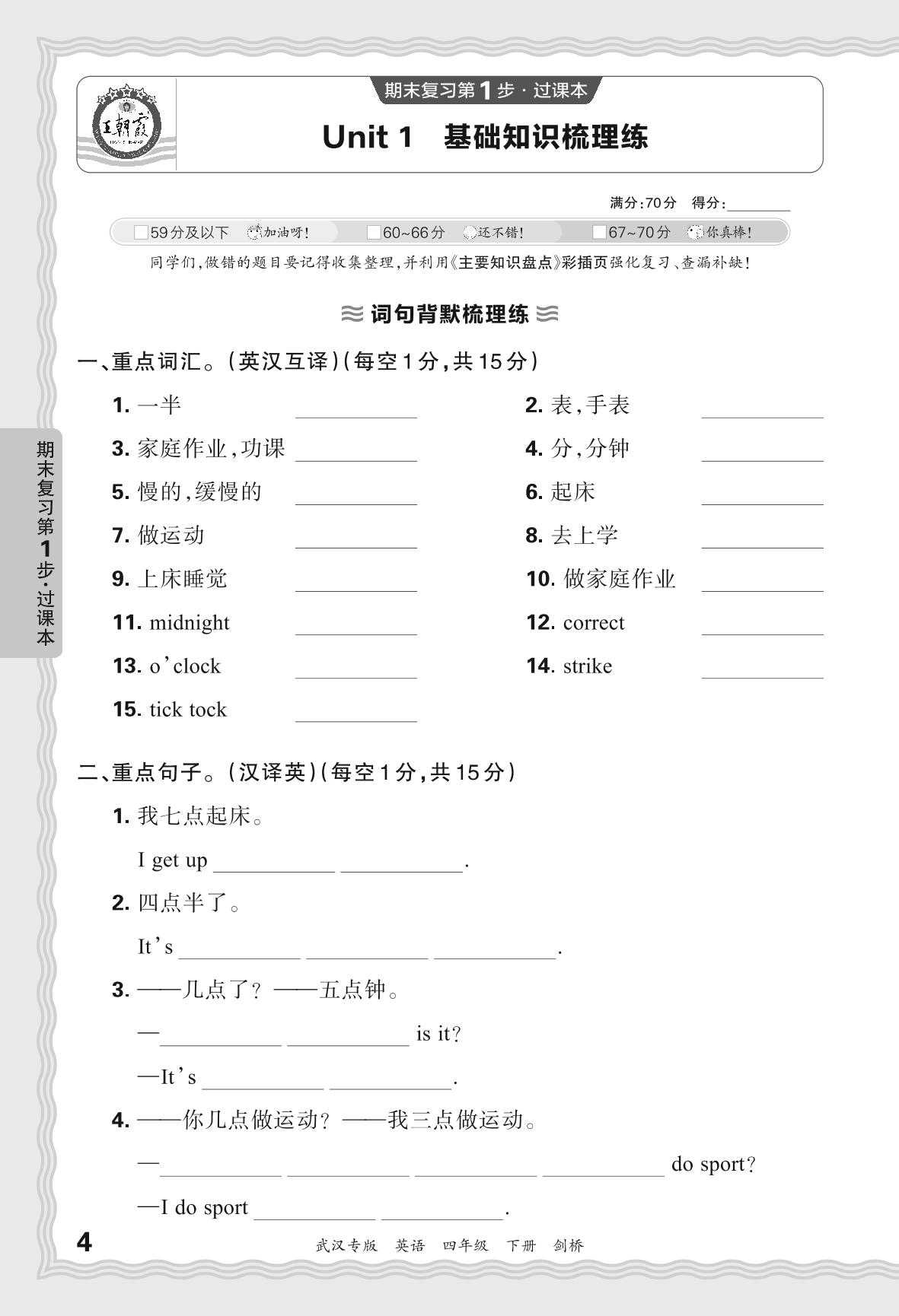 2024春下册四年级英语剑桥版 期末过课本武汉版·Unit 1 基础知识梳理练