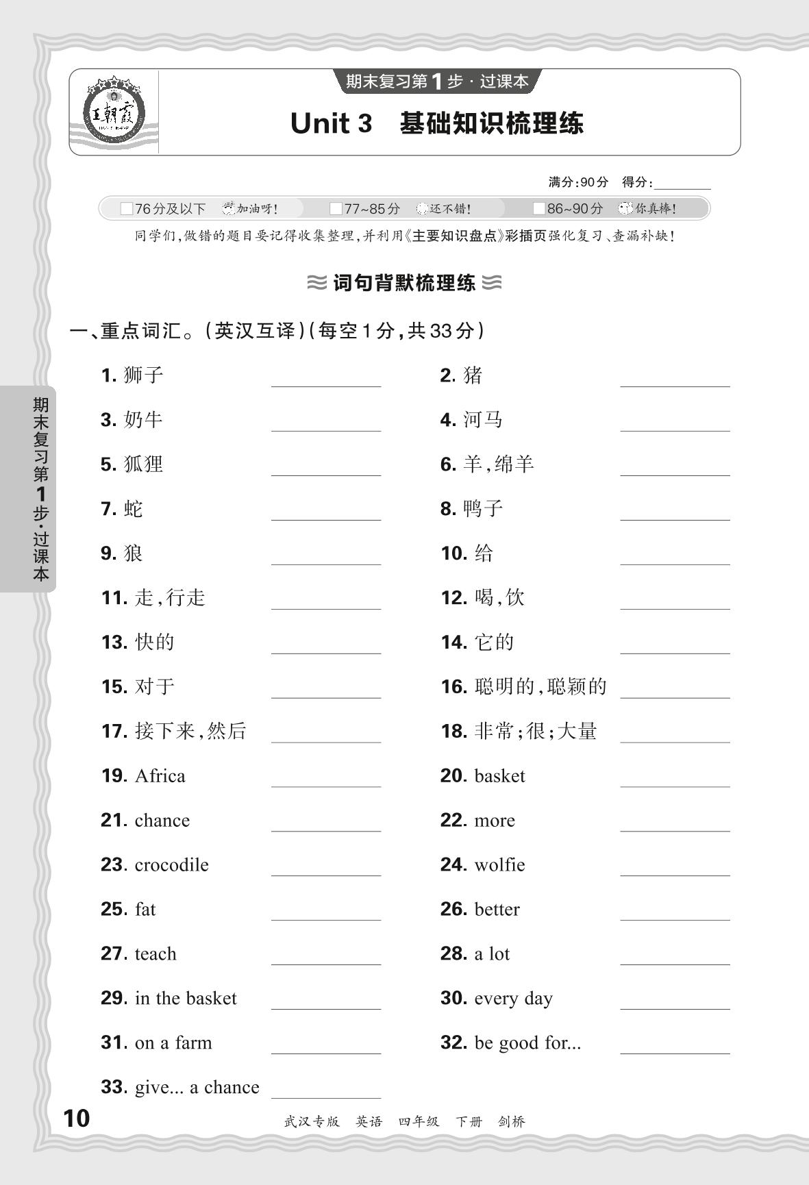 2024春下册四年级英语剑桥版 期末过课本武汉版·Unit 3 基础知识梳理练