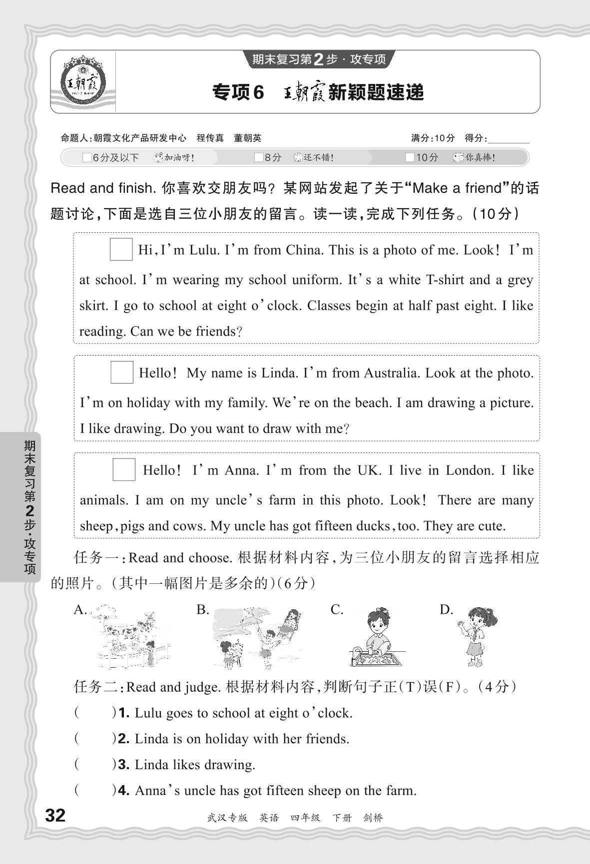 2024春下册四年级英语剑桥版 期末专项卷武汉版·王朝霞新颖题速递【6】