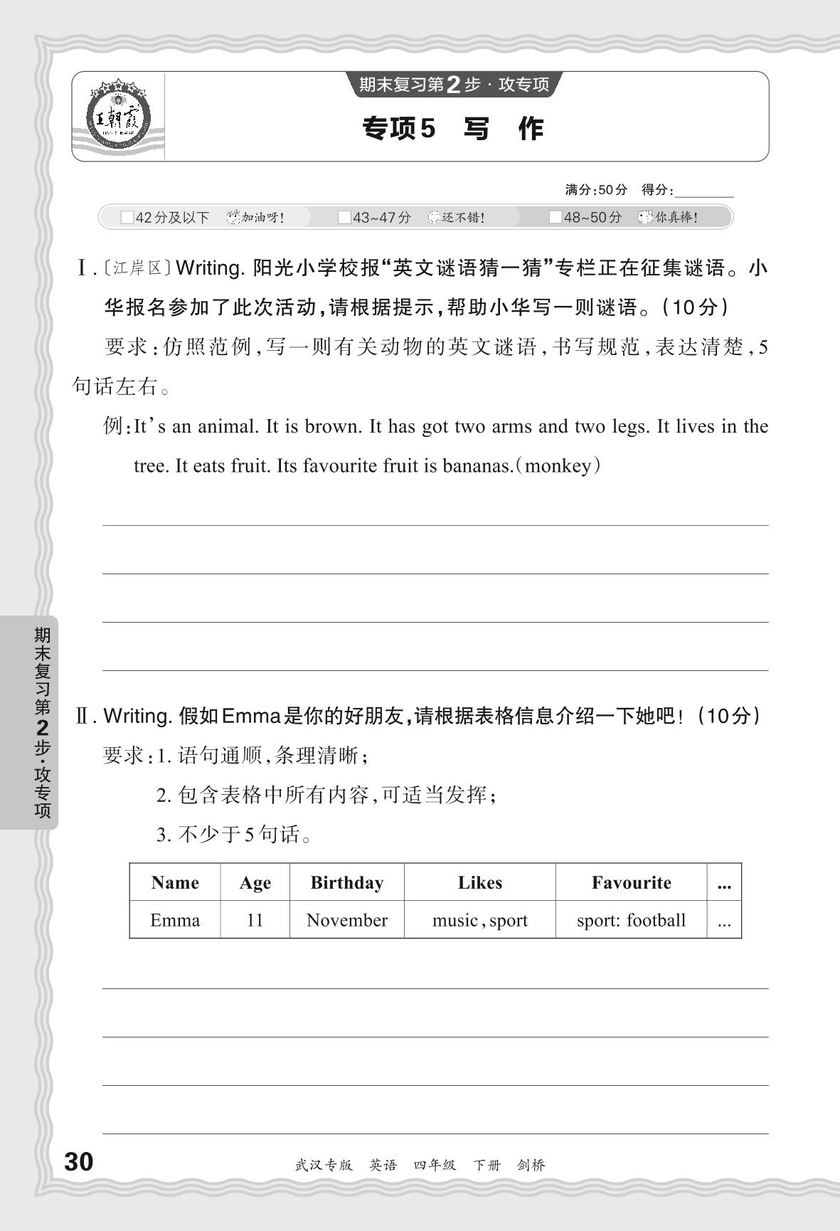 2024春下册四年级英语剑桥版 期末专项卷武汉版·写作【5】