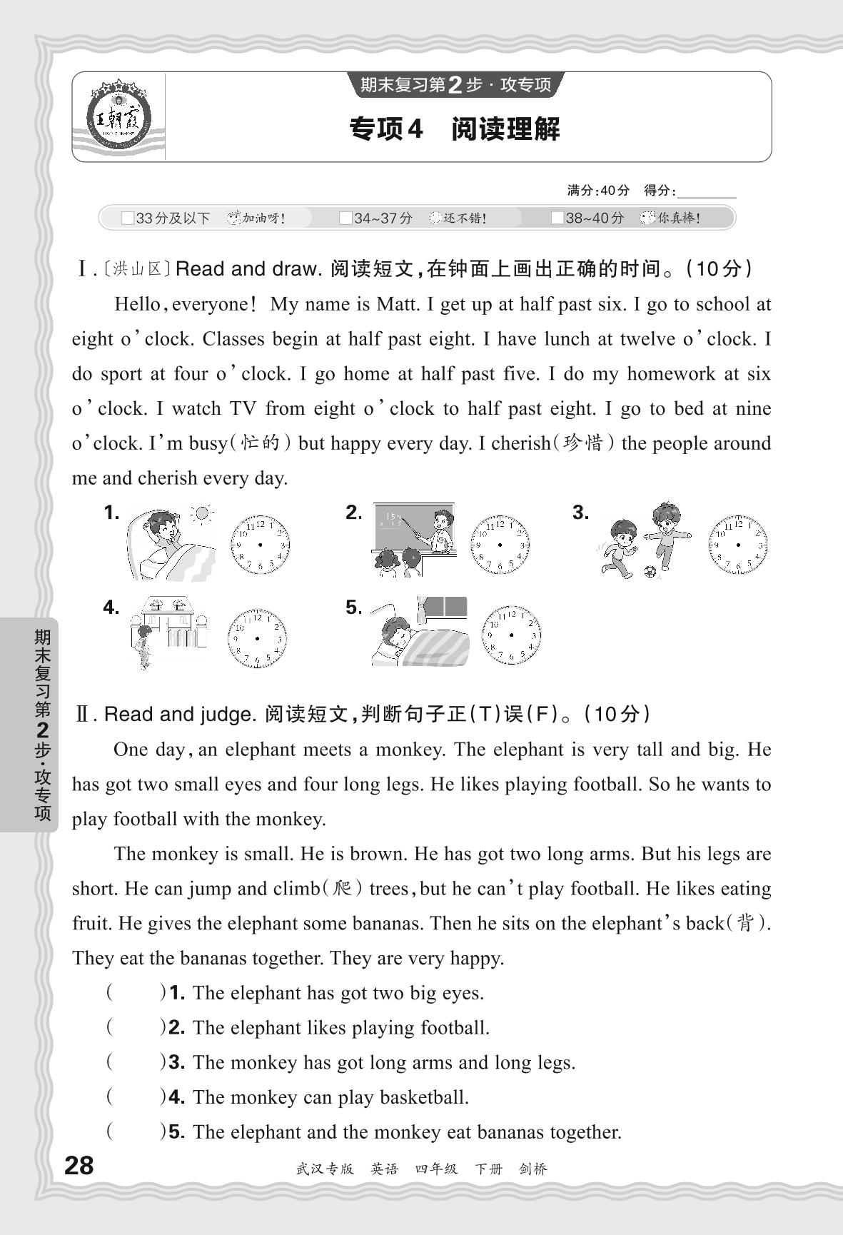 2024春下册四年级英语剑桥版 期末专项卷武汉版·阅读理解【4】