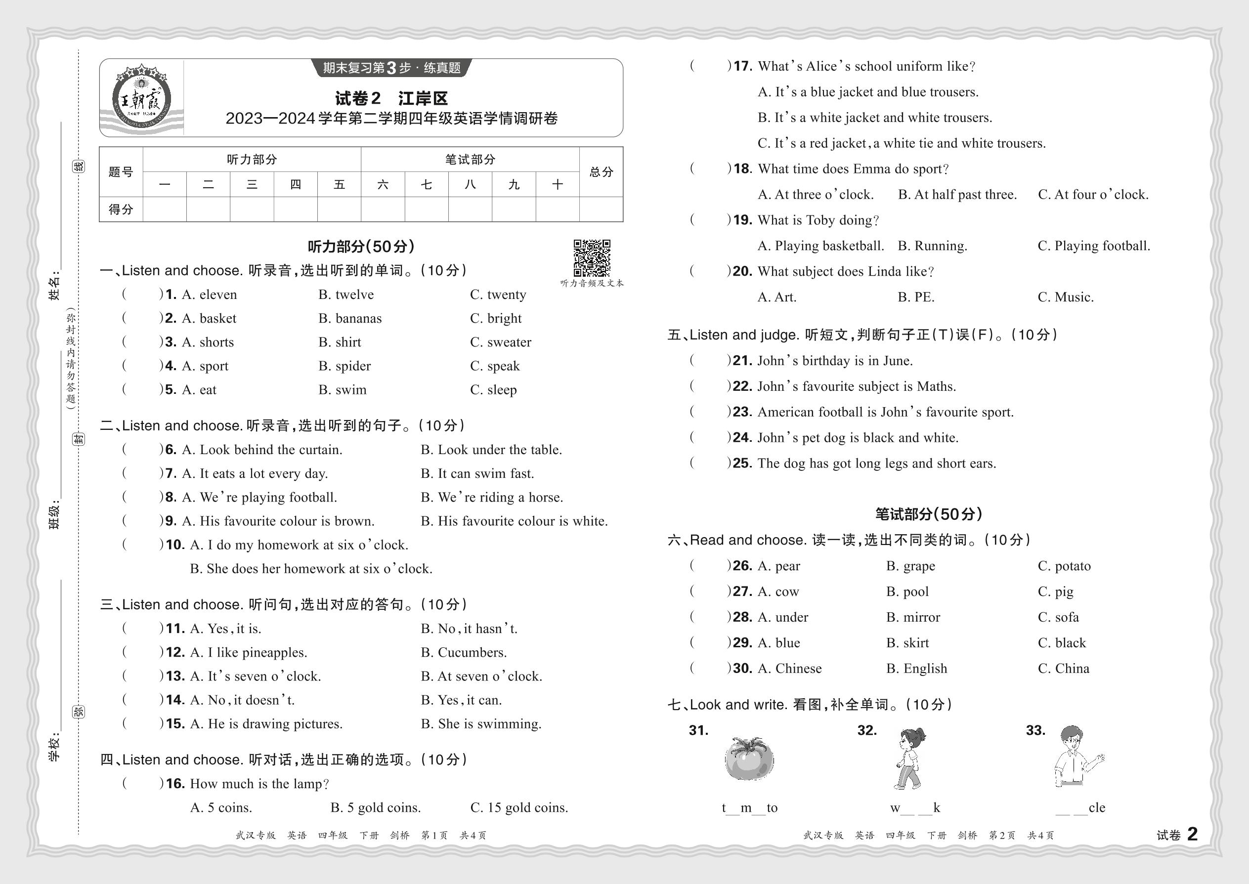湖北省武汉市江岸区2023—2024学年第二学期四年级英语学情调研卷(剑桥版)【2】