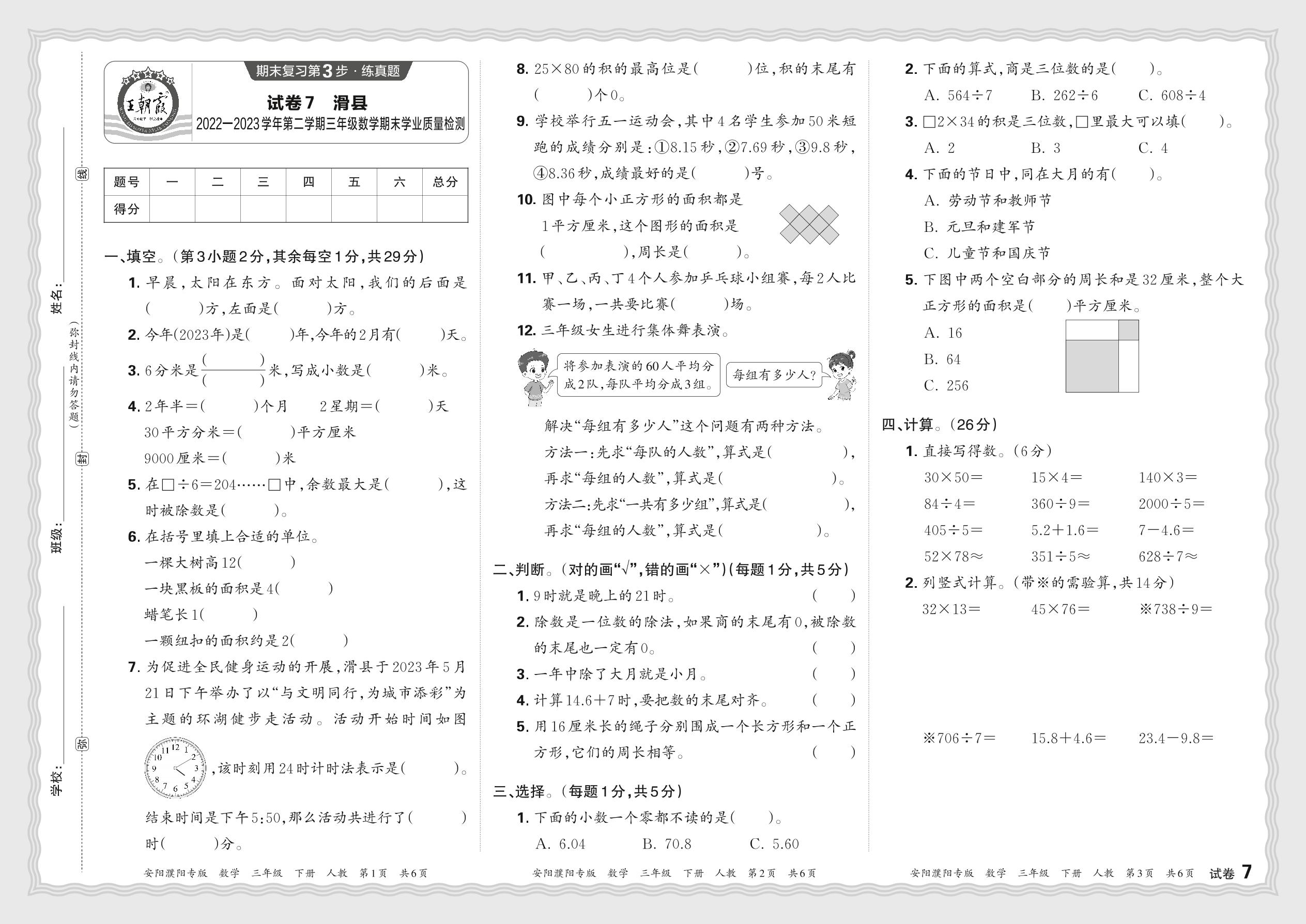 河南省安阳市滑县2022-2023学年第二学期三年级数学期末学业质量检测(人教版)【7】
