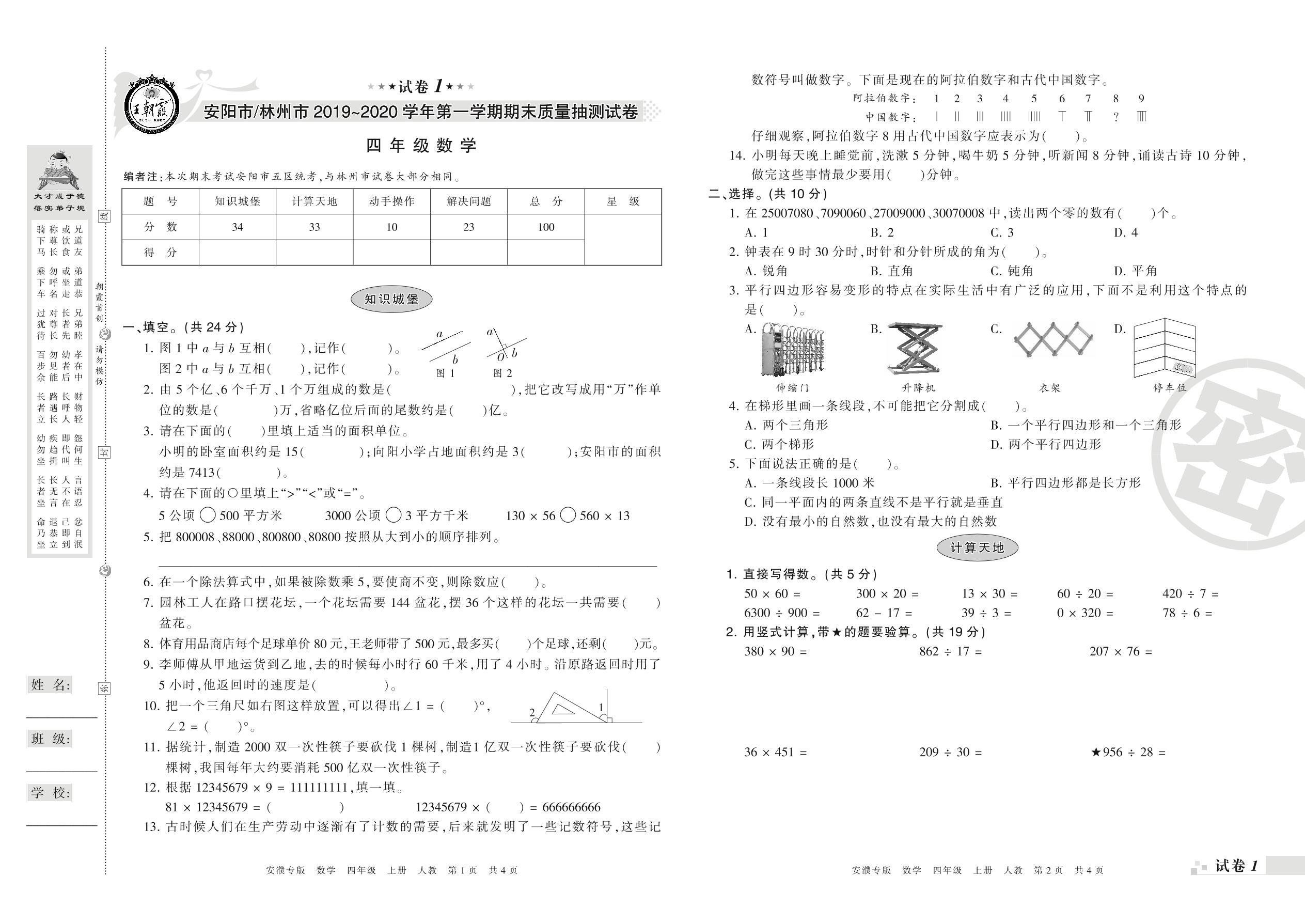 2019-2020学年第一学期安阳市、林州市四年级数学试卷(人教版)【1】