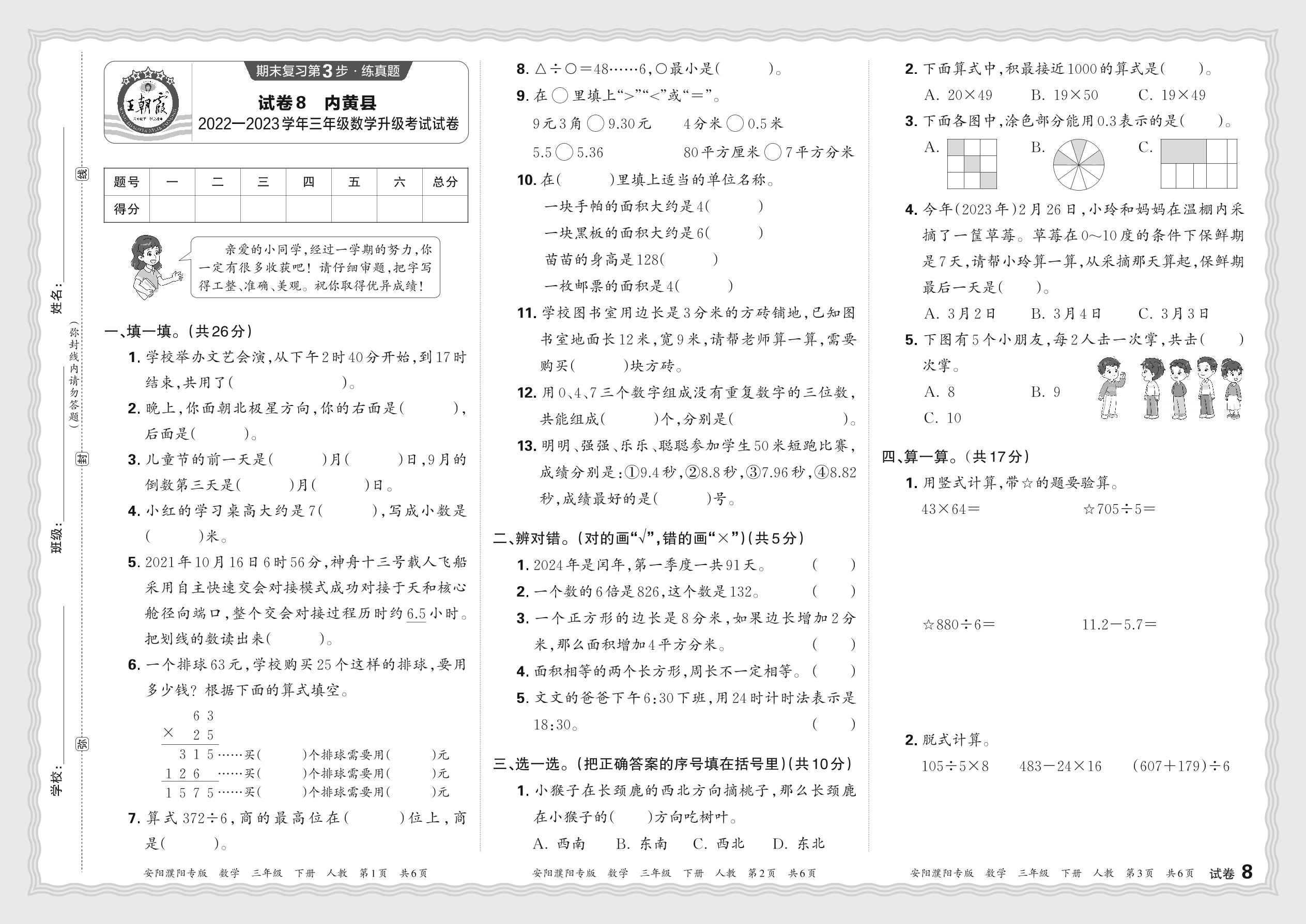 河南省安阳市内黄县2022-2023学年三年级数学升级考试试卷(人教版)【8】