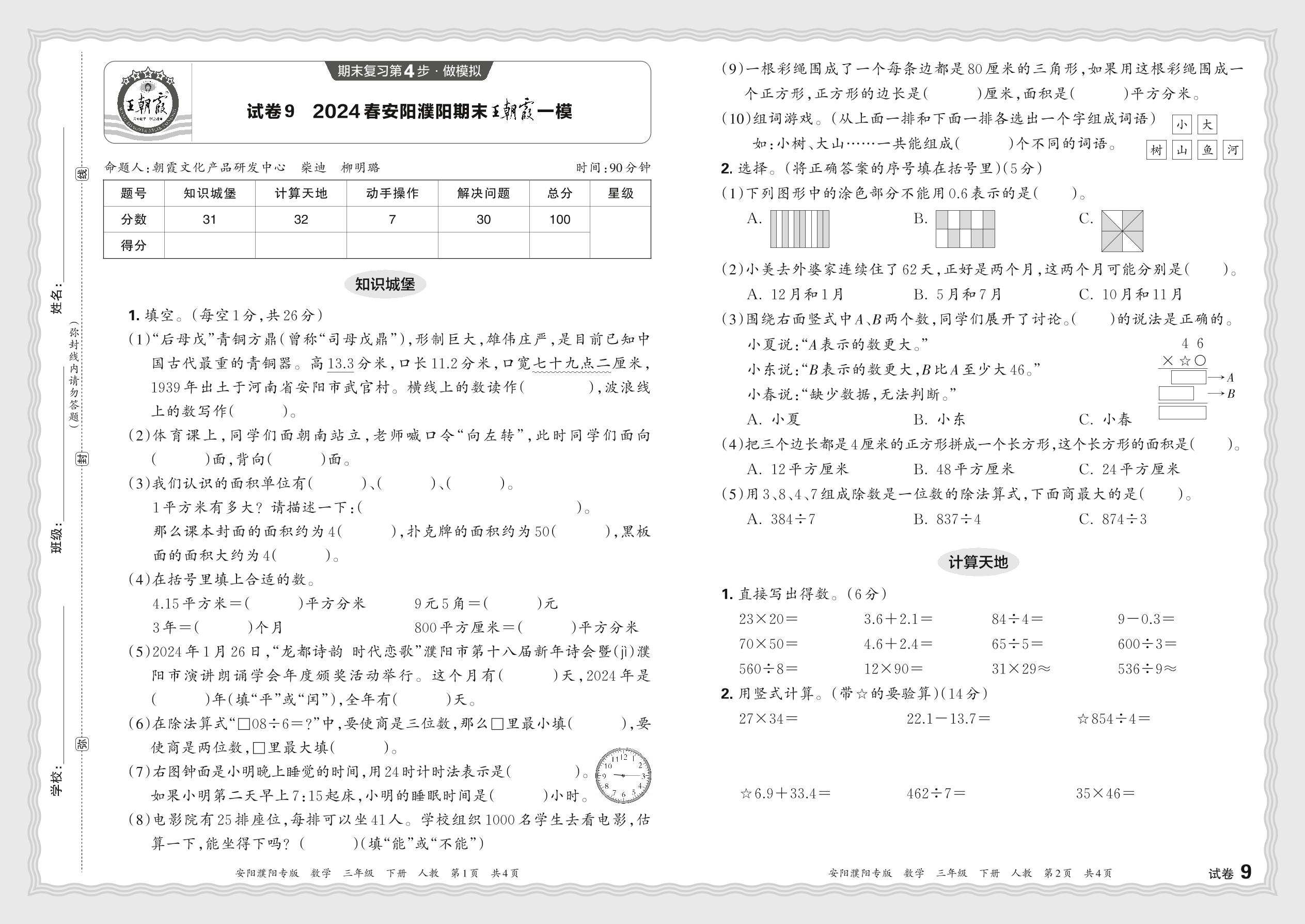 2024春下册三年级数学人教版 河南安阳濮阳期末王朝霞一模【9】