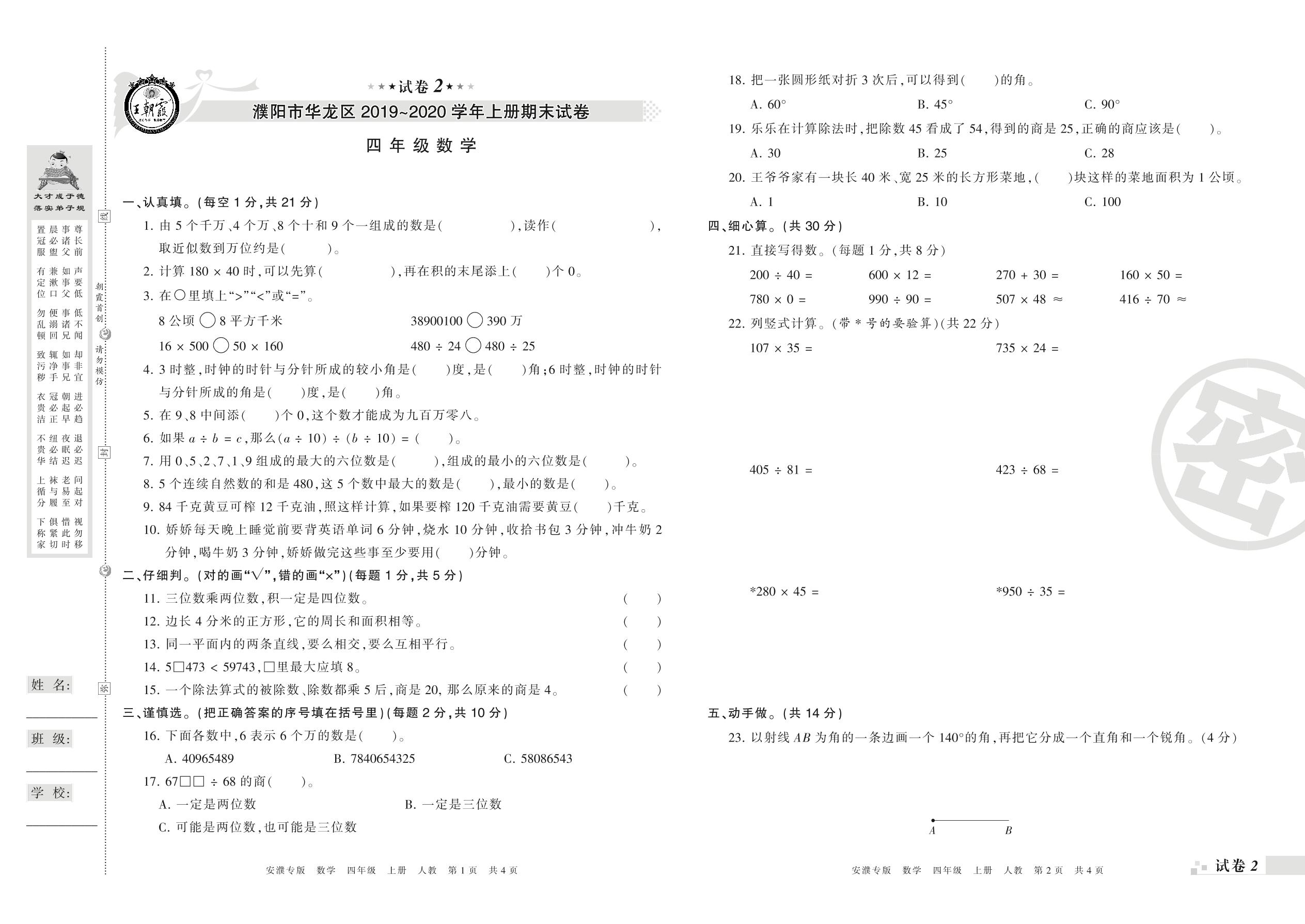 2019-2020学年第一学期濮阳市华龙区四年级数学试卷(人教版)【2】
