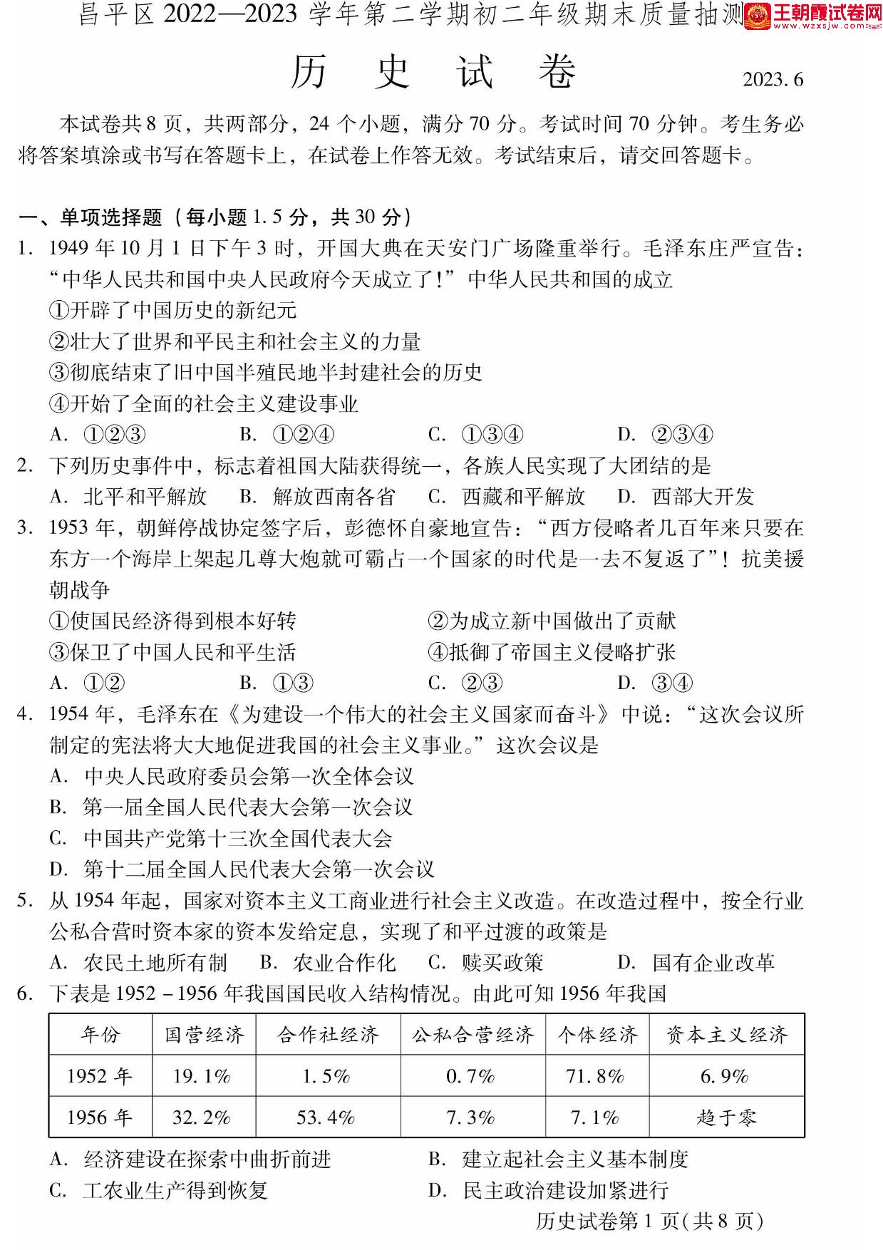 北京市昌平区2022-2023学年下学期期末试题八年级历史(人教版)