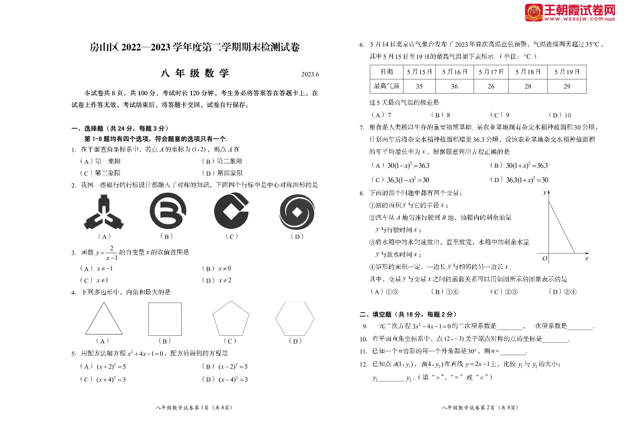 北京市房山区2022—2023学年度第二学期期末检测试卷八年级数学(北京版)