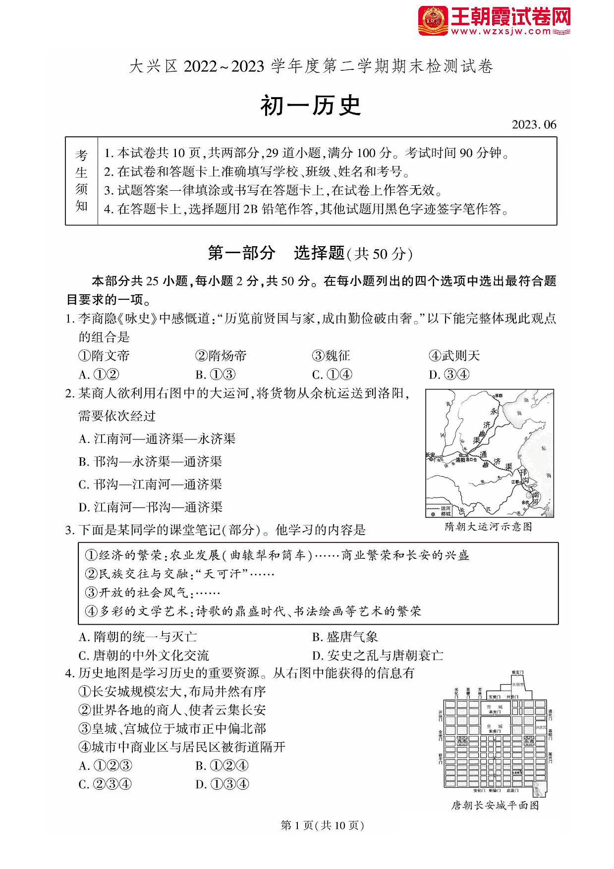 北京市大兴区2022-2023学年下学期期末检测试题七年级历史(人教版)