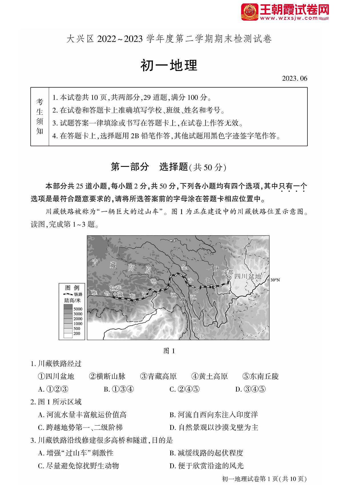 北京市大兴区2022-2023学年下学期期末考试试卷七年级地理(人教版)