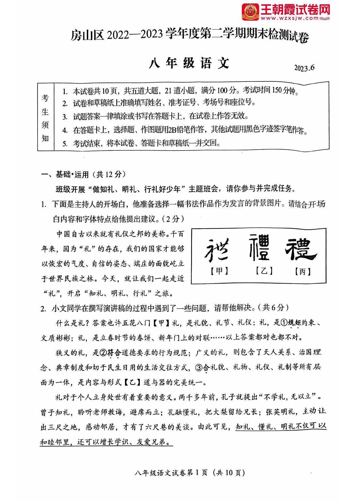 北京市房山区2022-2023学年度第二学期期末检测八年级语文(人教版)