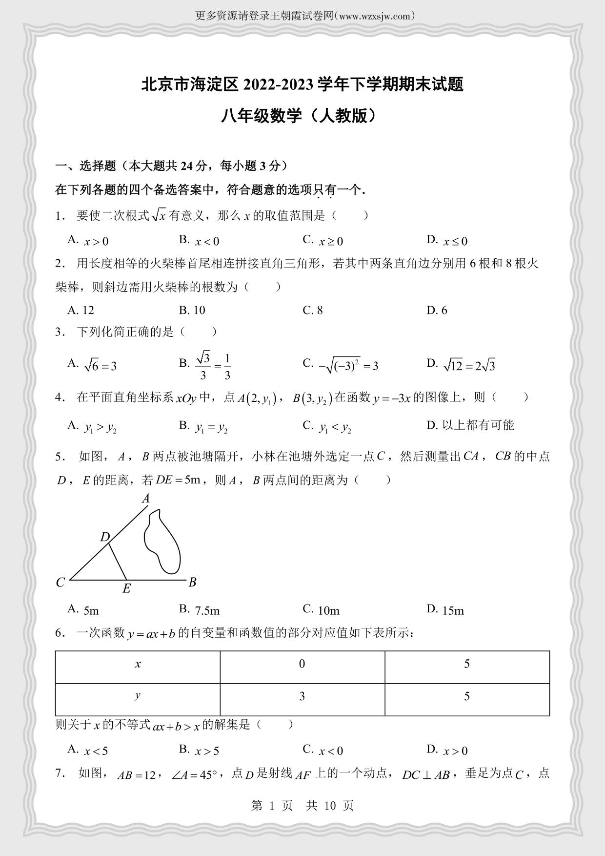 北京市海淀区2022-2023学年下学期期末试题八年级数学(人教版)