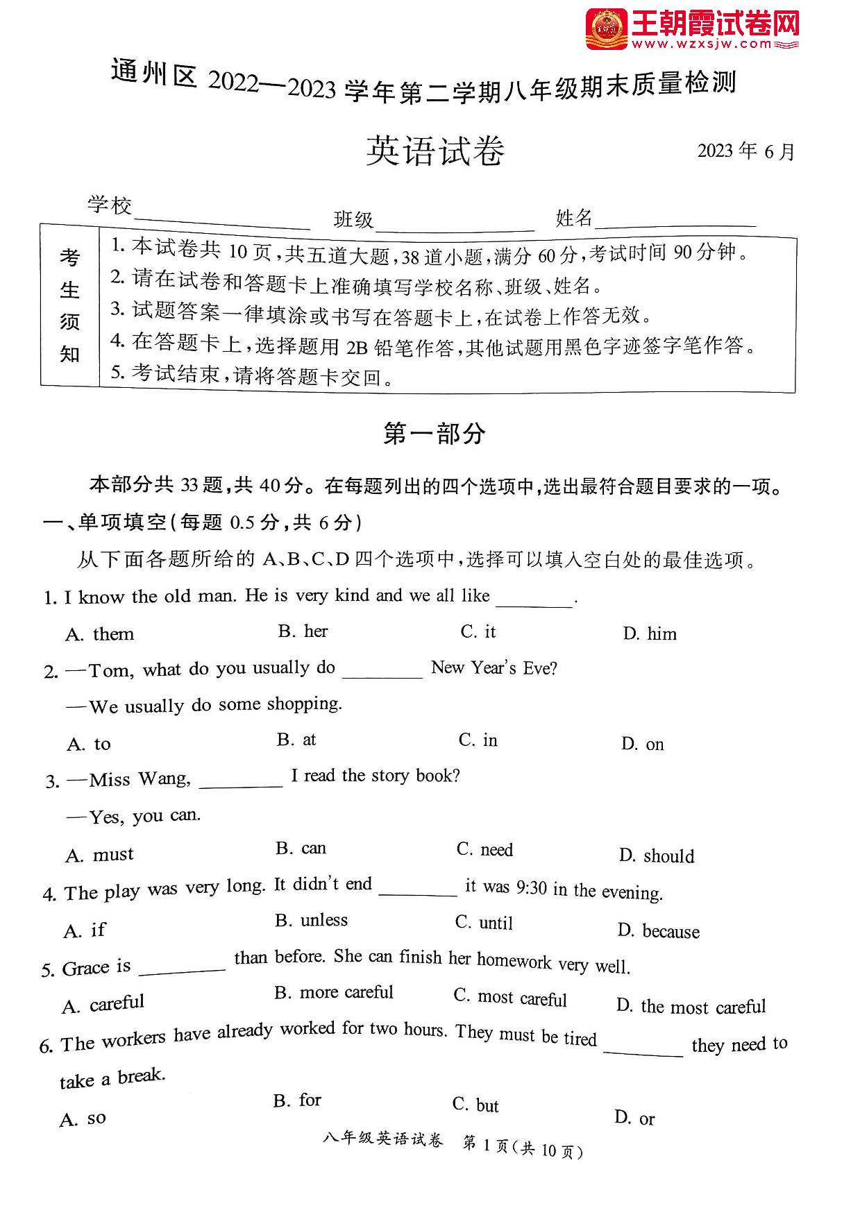 北京市通州区2022-2023学年下学期期末考试试卷八年级英语(人教版)