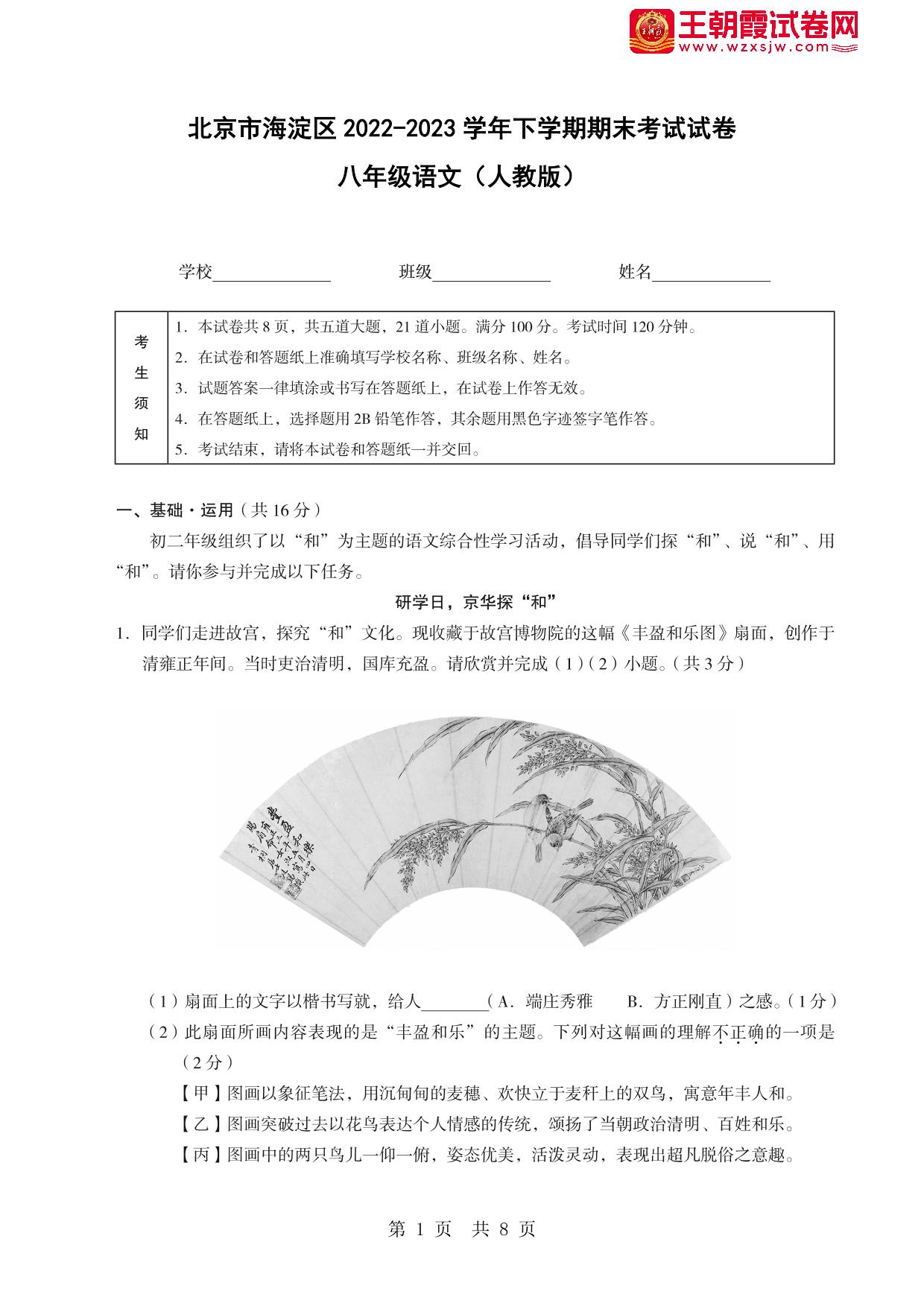 北京市海淀区2022-2023学年下学期期末考试试卷八年级语文(人教版)