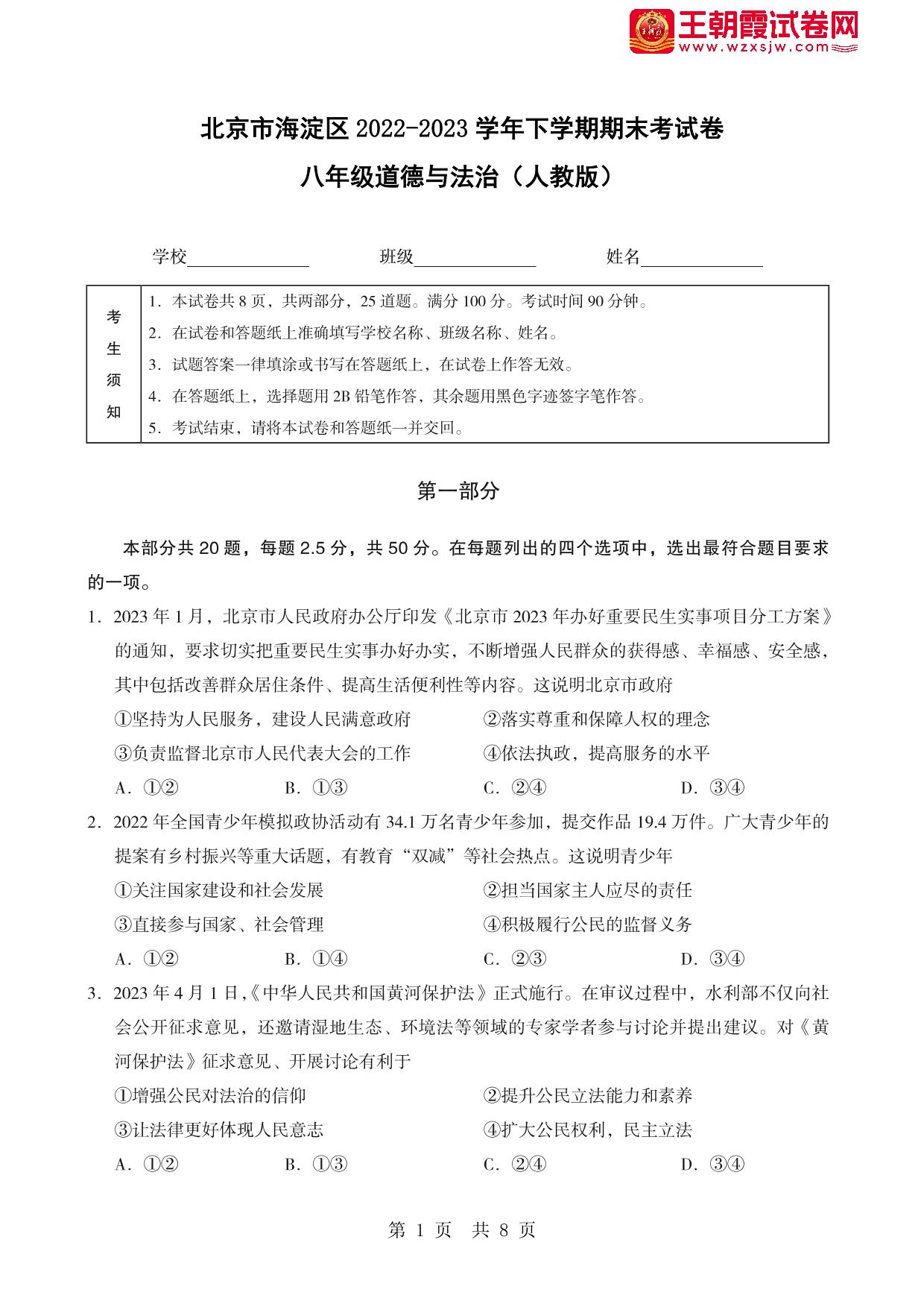 北京市海淀区2022-2023学年下学期期末考试卷八年级道德与法治(人教版)