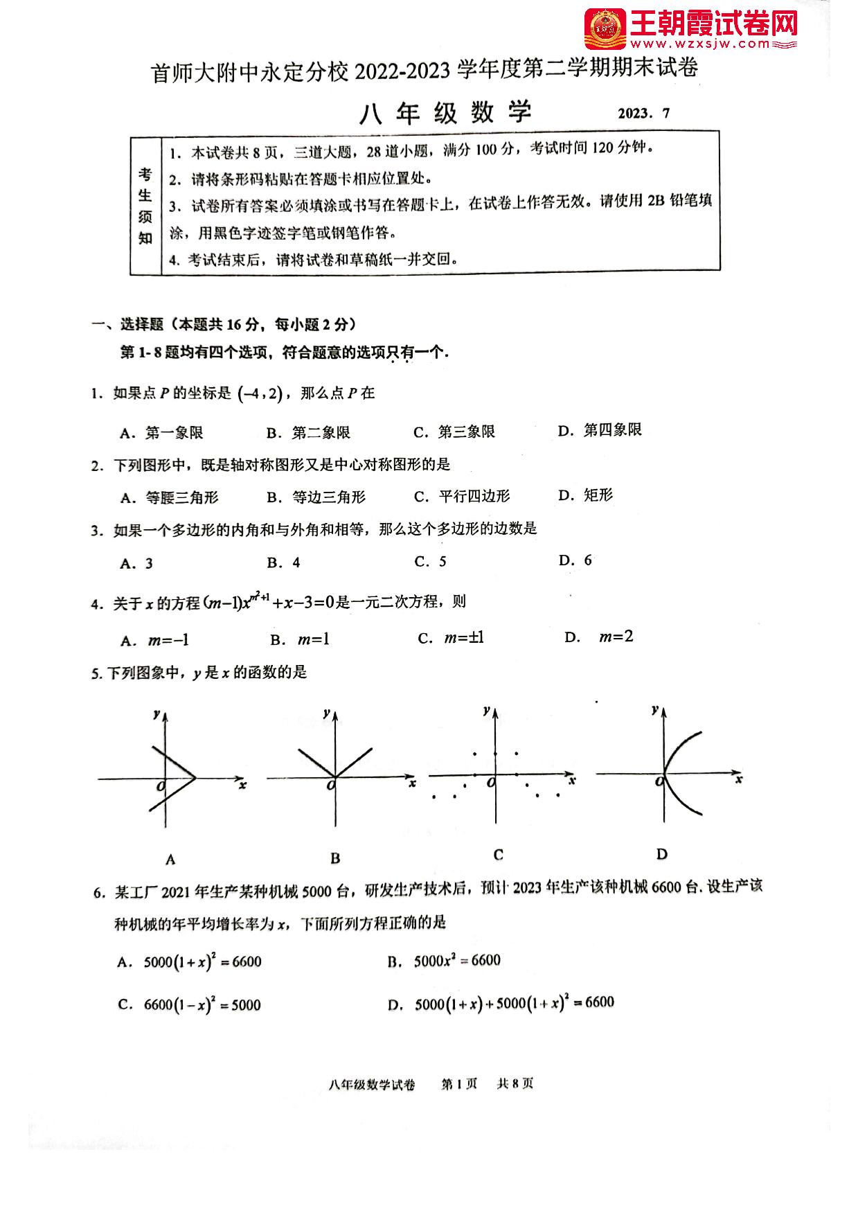 北京市首师大附中永定分校2022-2023学年下学期期末试卷八年级数学(人教版)
