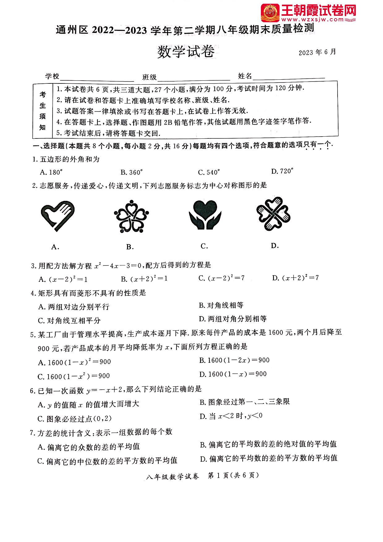 北京市通州区2022-2023学年下学期期末试卷八年级数学(人教版)