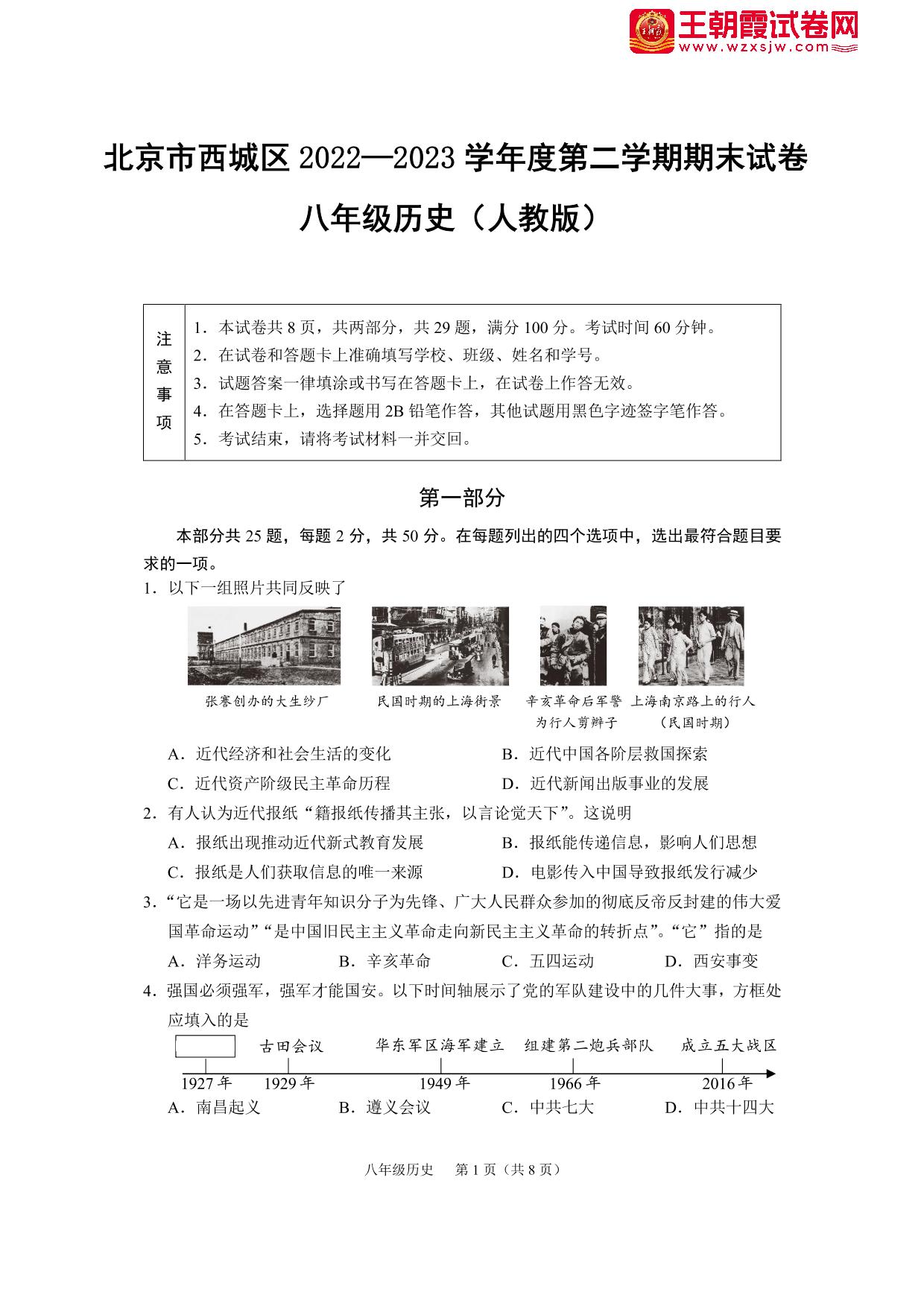 北京市西城区2022-2023学年第二学期期末试题八年级历史(人教版)