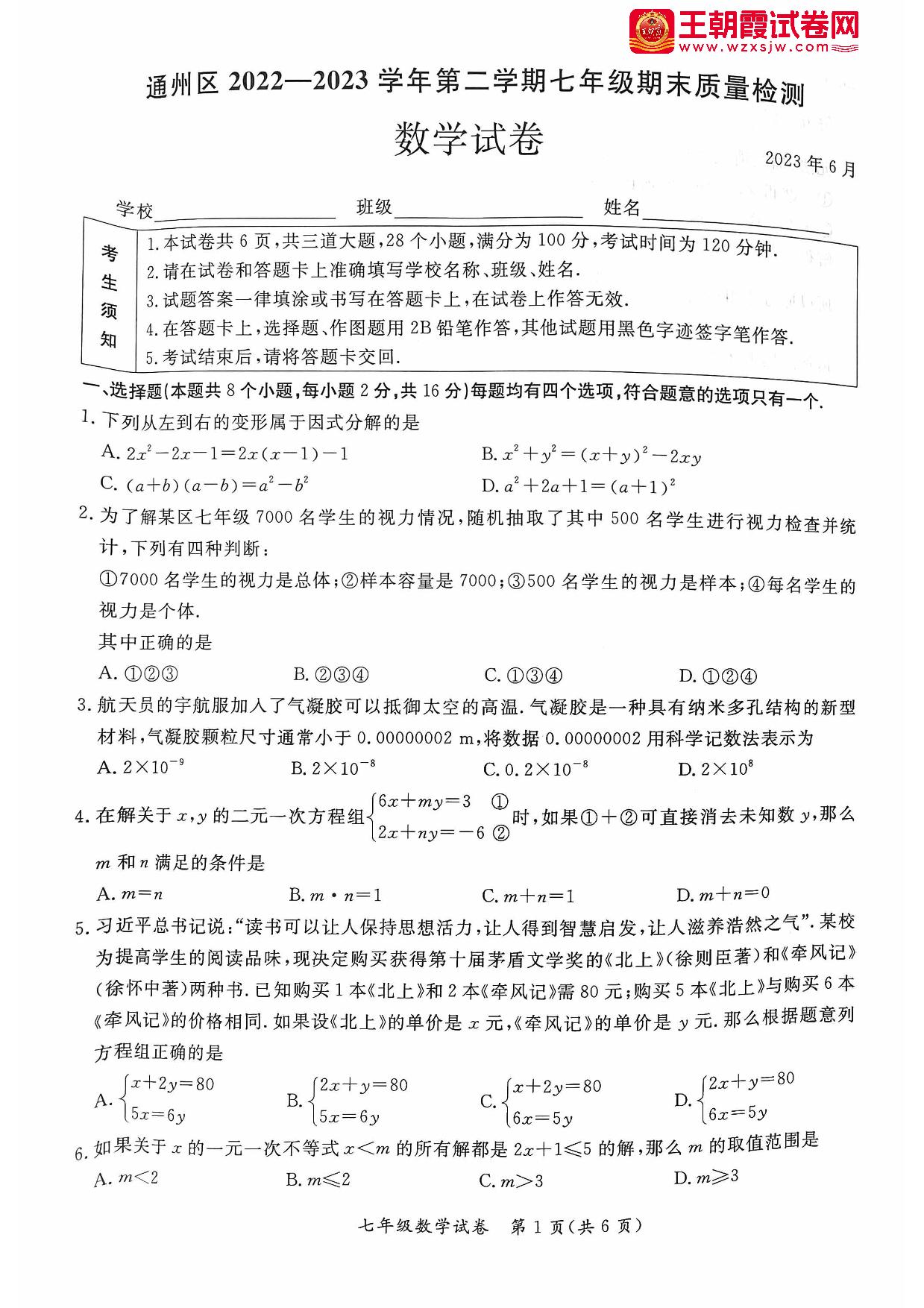 北京市通州区2022-2023学年下学期期末质量检测试卷七年级数学(人教版)