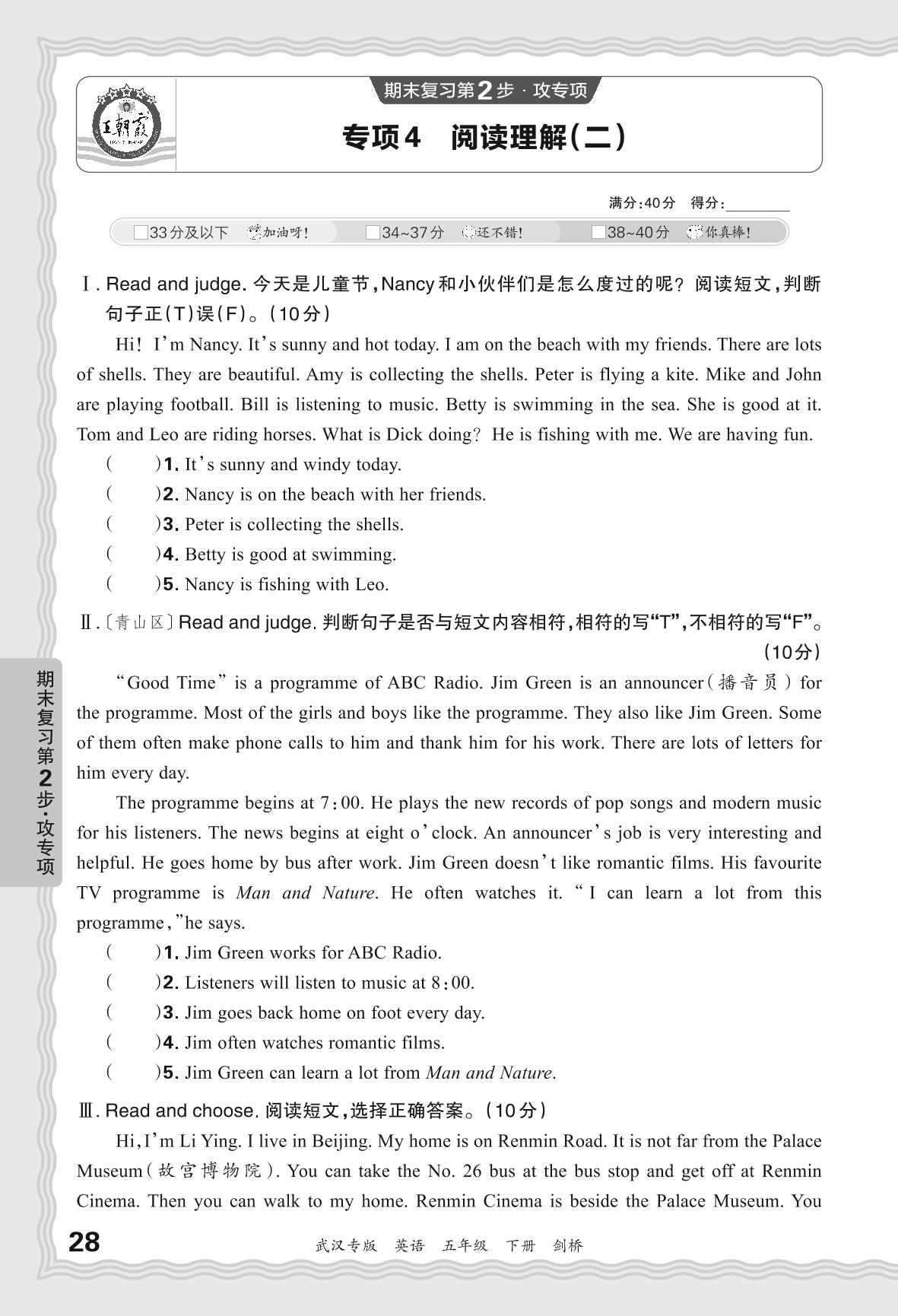 2024春下册五年级英语剑桥版 期末专项卷武汉版·阅读理解(二)【4】