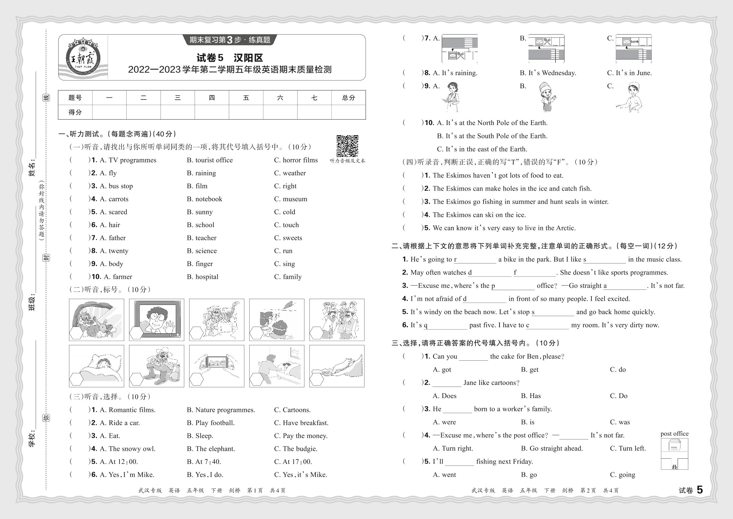 湖北省武汉市汉阳区2022—2023学年第二学期五年级英语期末质量检测(剑桥版)【5】