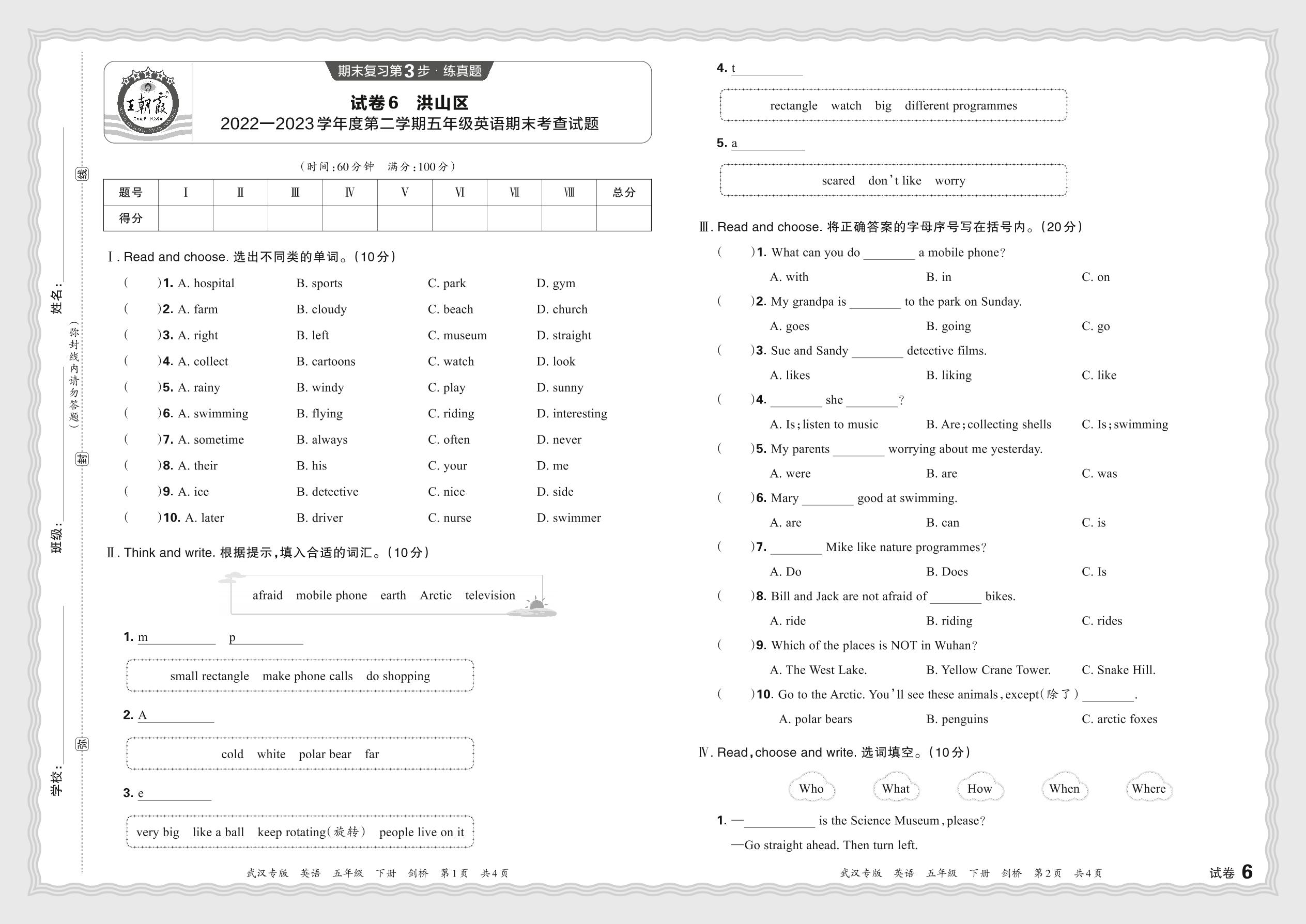湖北省武汉市洪山区2022—2023学年第二学期五年级英语期末考查试题(剑桥版)【6】