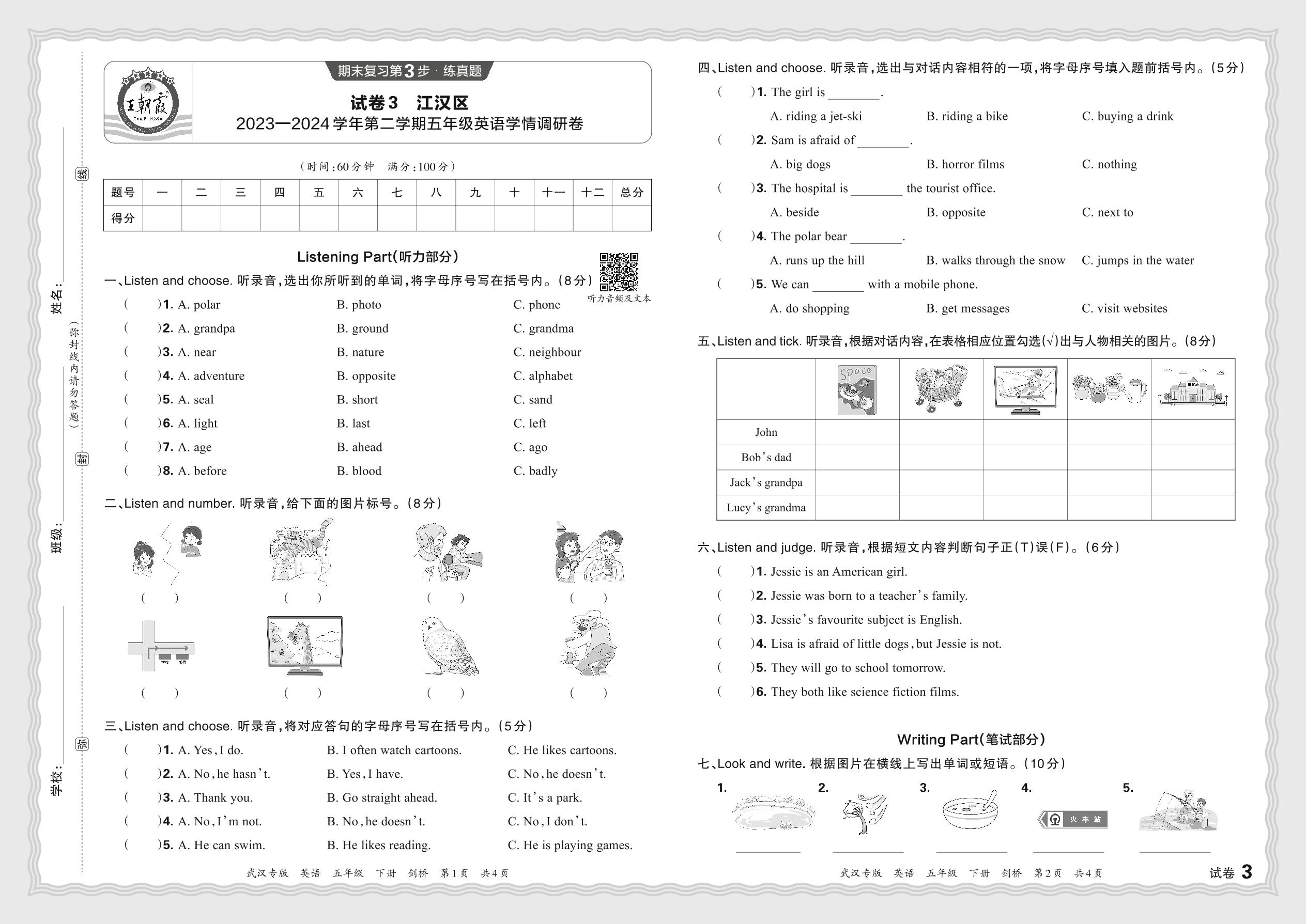 湖北省武汉市江汉区2023—2024学年第二学期五年级英语学情调研卷(剑桥版)【3】