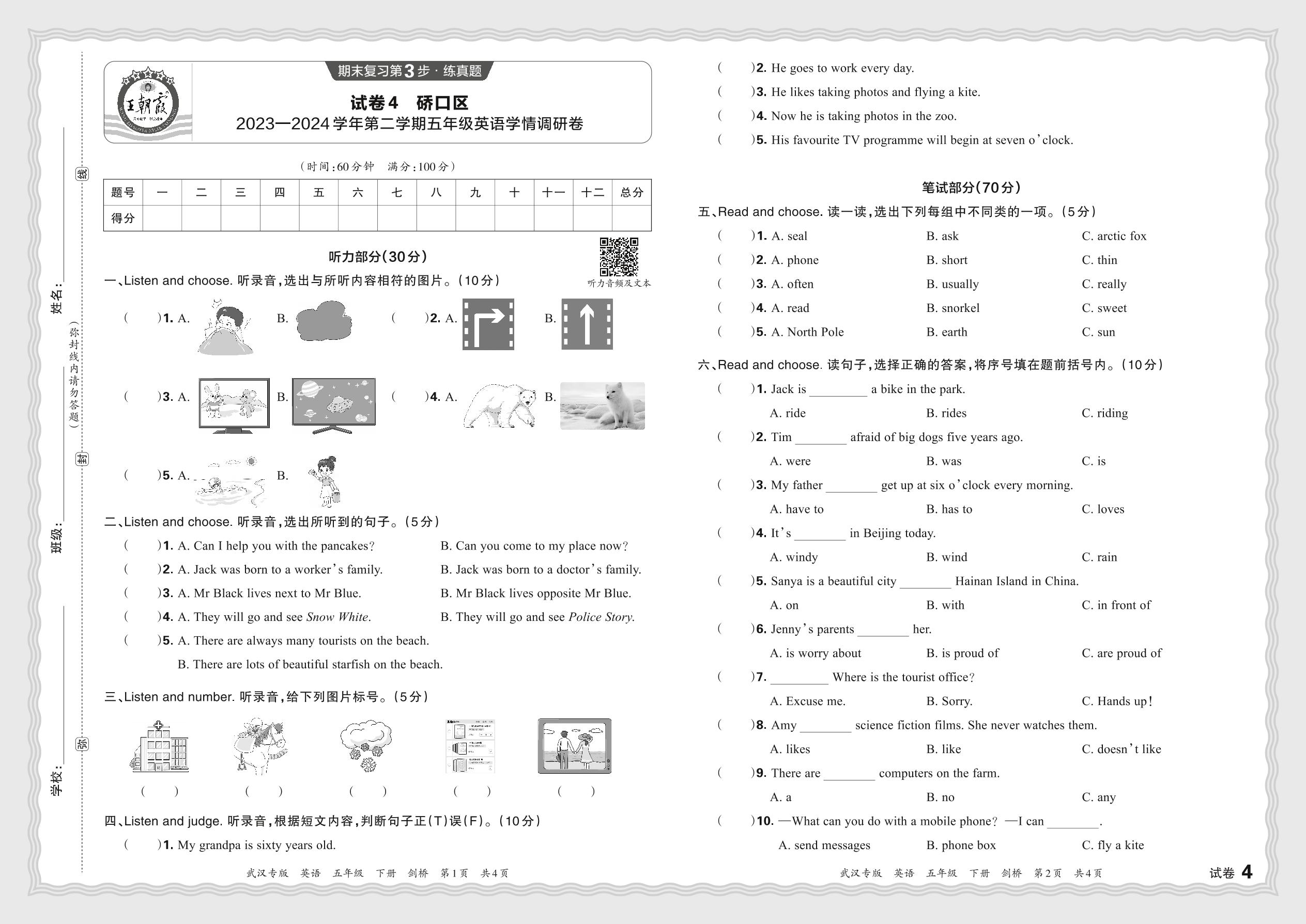 湖北省武汉市硚口区2023—2024学年第二学期五年级英语学情调研卷(剑桥版)【4】