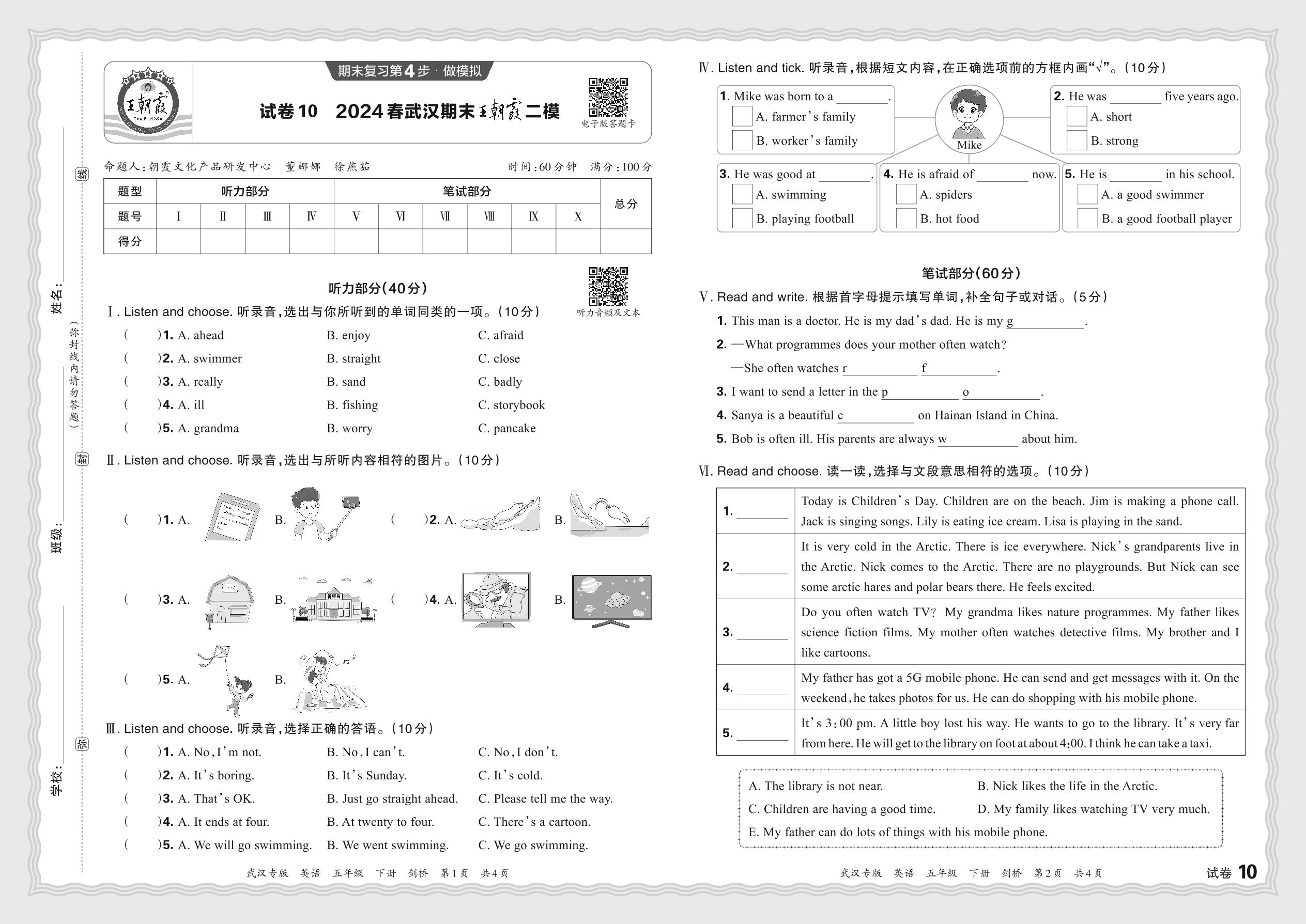 2024春下册五年级英语剑桥版 湖北武汉期末王朝霞二模【10】
