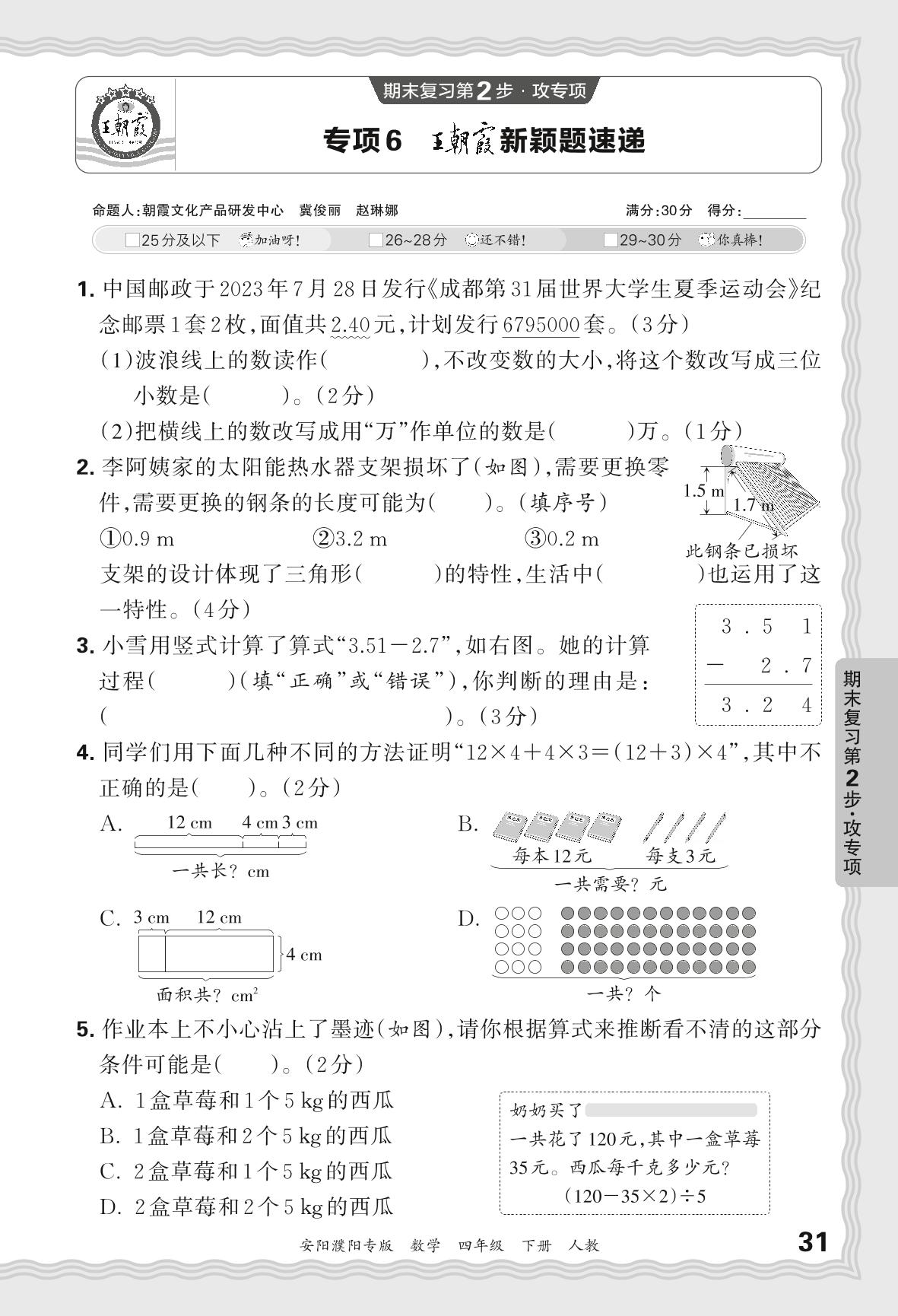 2024春下册四年级数学人教版 期末专项卷安阳濮阳版·王朝霞新颖题速递【6】