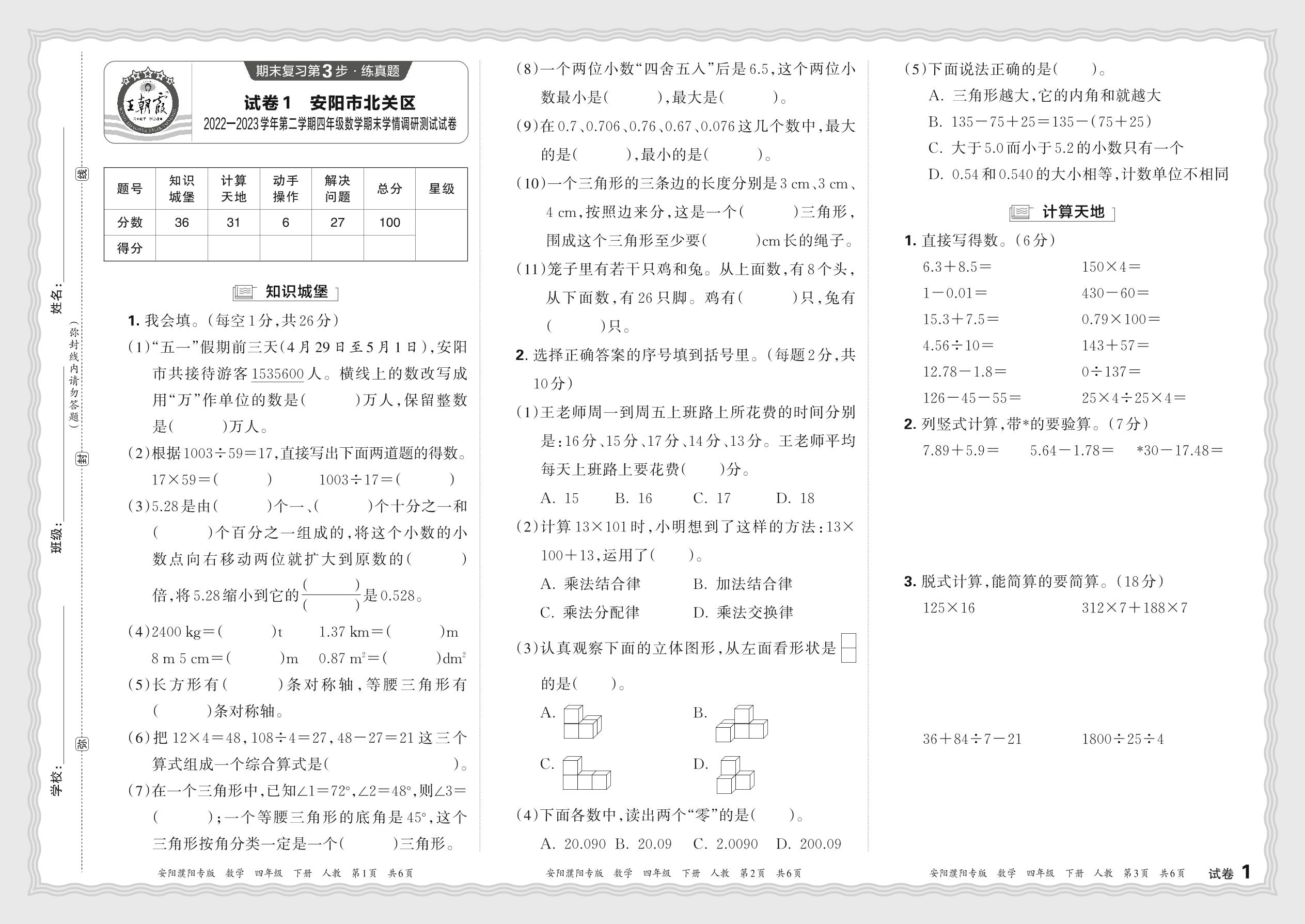 河南省安阳市北关区2022-2023学年第二学期四年级数学期末学情调研测试试卷(人教版)【1】