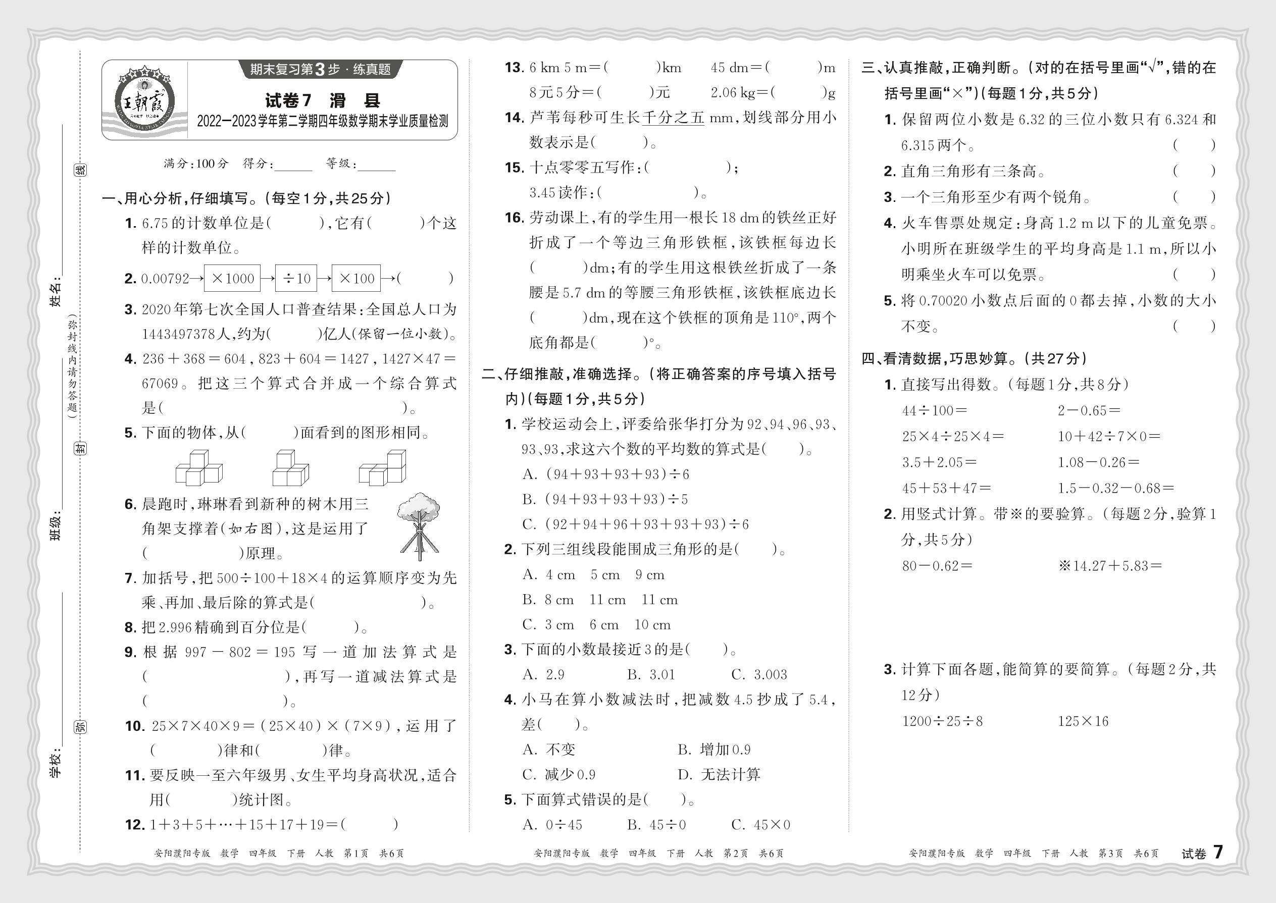 河南省安阳市滑县2022-2023学年第二学期四年级数学期末学业质量检测(人教版)【7】