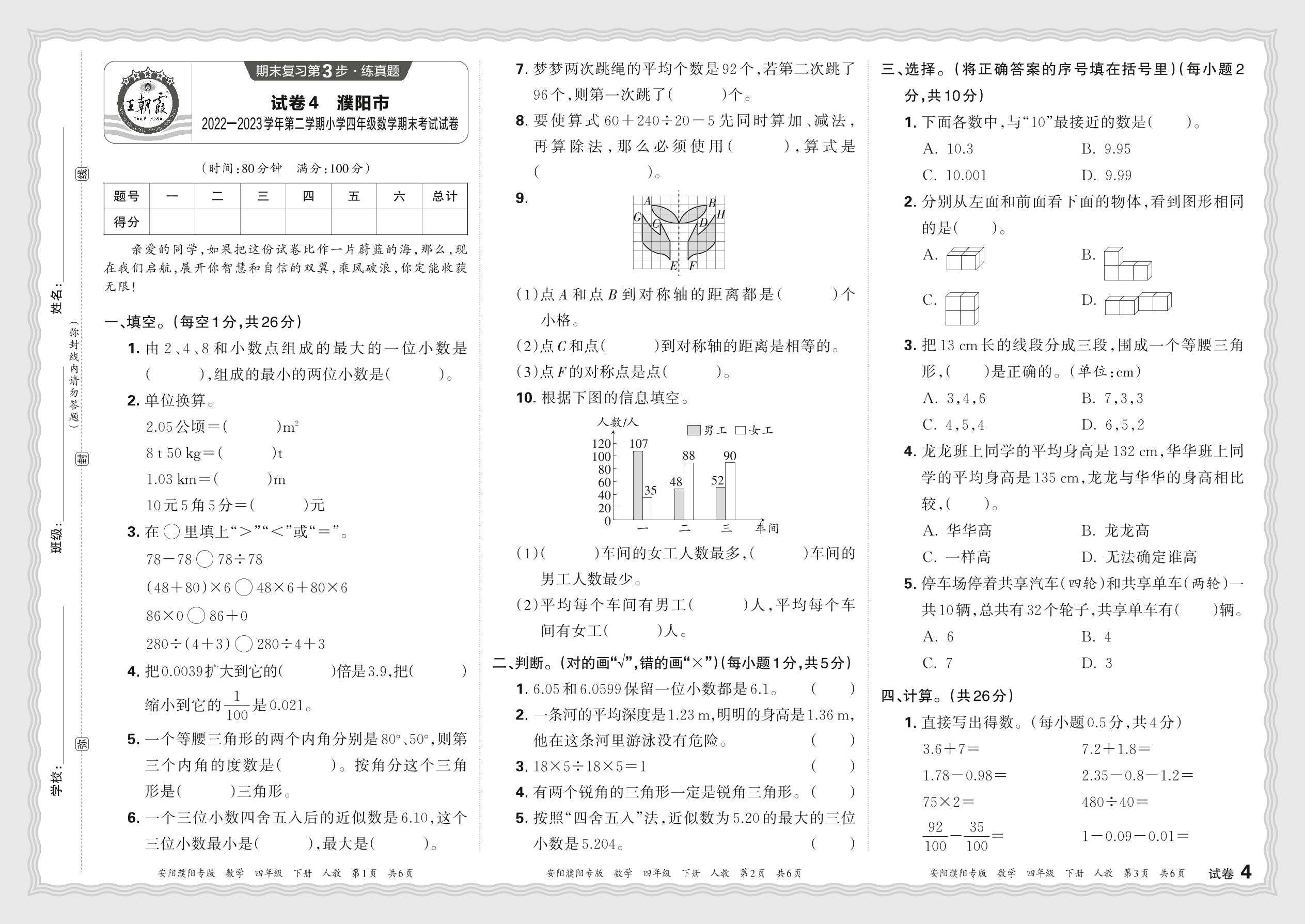 河南省濮阳市2022-2023学年第二学期小学四年级数学期末考试试卷(人教版)【4】