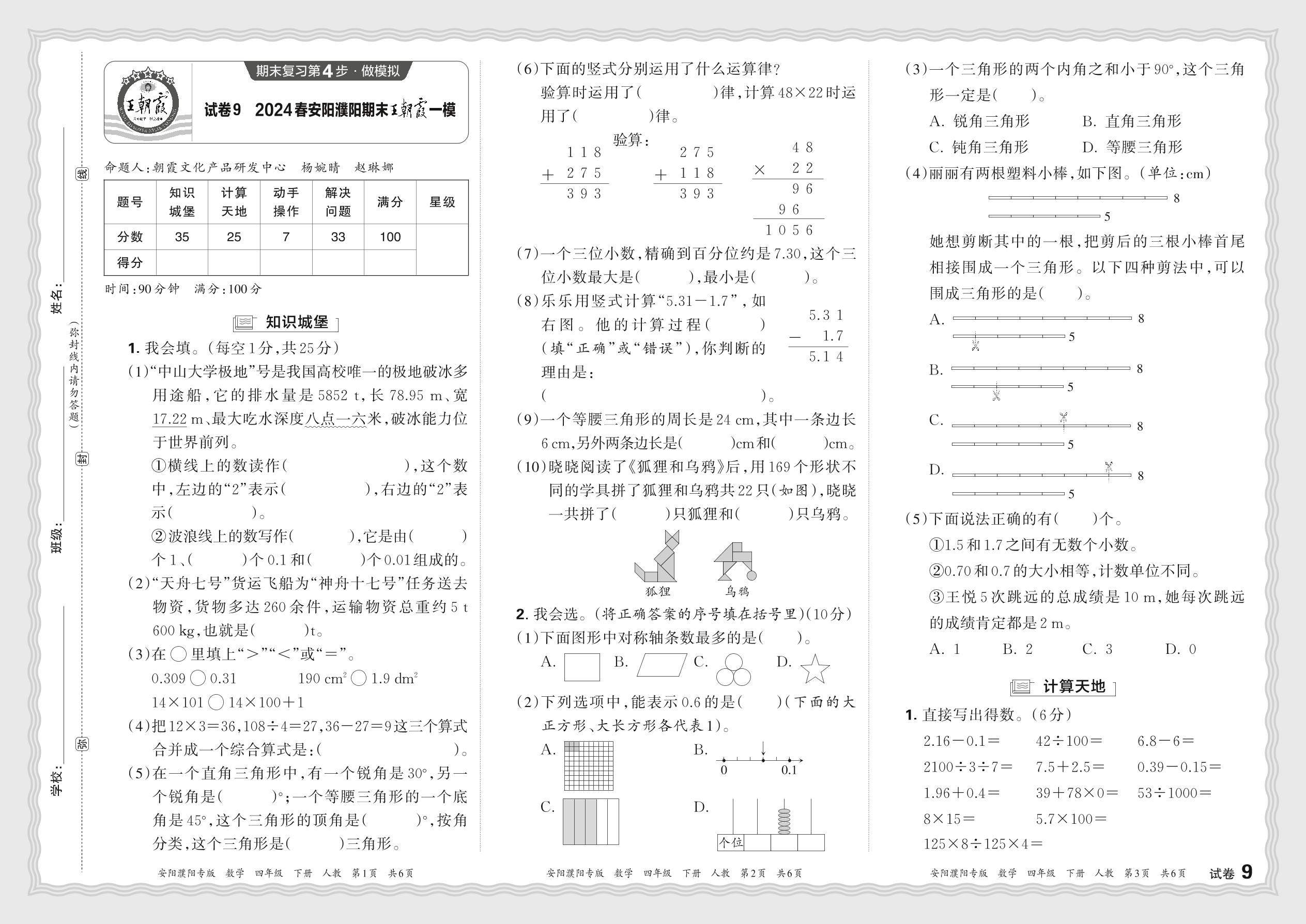 2024春下册四年级数学人教版 河南安阳濮阳期末王朝霞一模【9】
