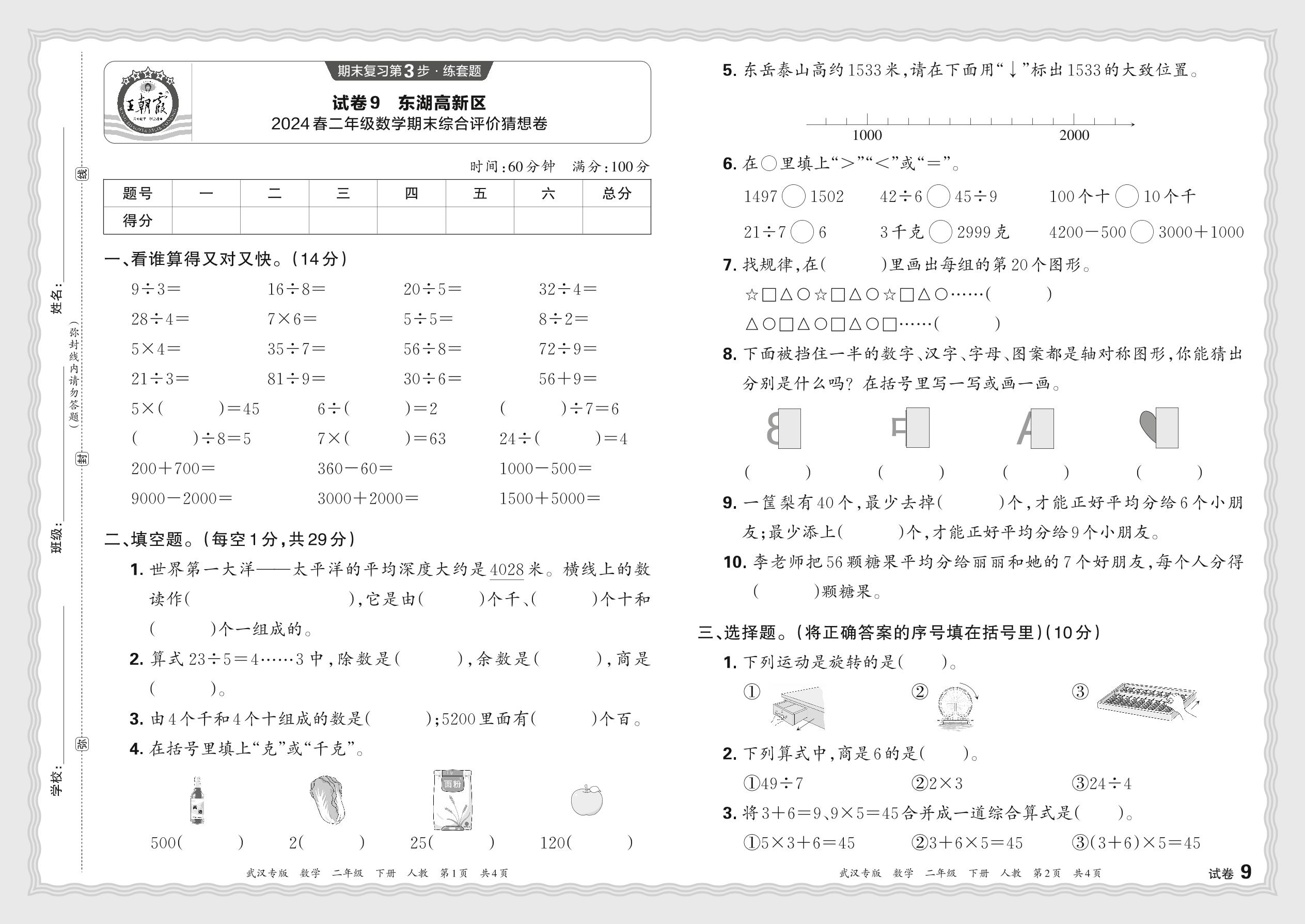 湖北省武汉市东湖高新区2024春二年级数学期末综合评价猜想卷(人教版)