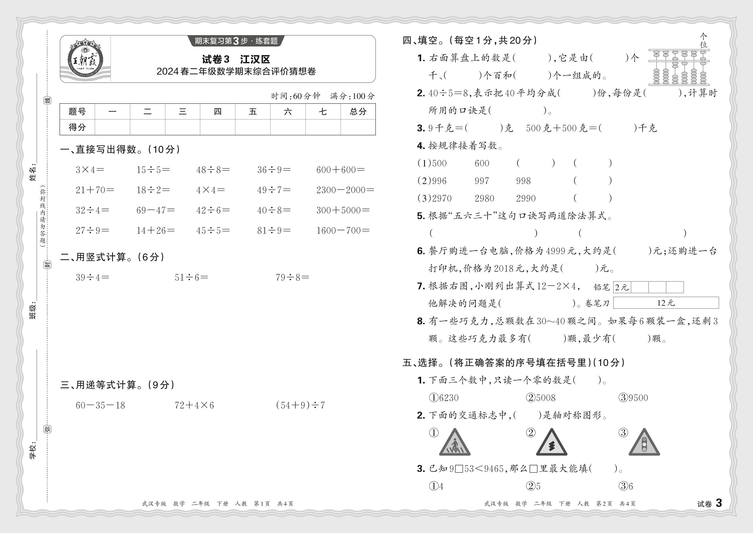 湖北省武汉市江汉区2024春二年级数学期末综合评价猜想卷(人教版)